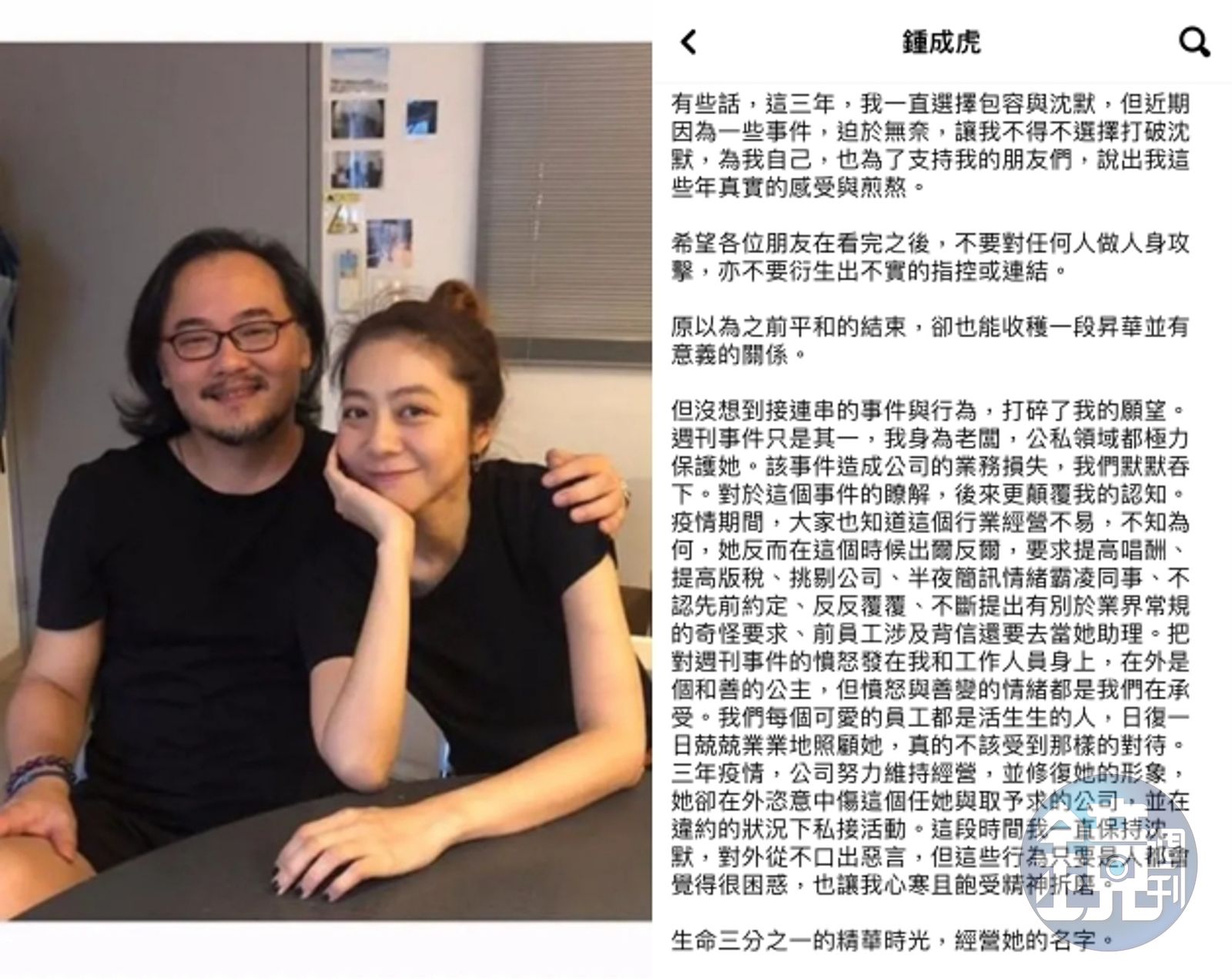 但沒想到接連串的事件與行為,打碎了我的願望。週刊事件只是其一,我身為老闆,公私領域都極力保護她。該事件造成公司的業務損失,我們默默吞下。對於這個事件的瞭解,後來更顛覆我的認知。疫情期間,大家也知道這個行業經營不易,不知為何,她反而在這個時候出爾反爾,要求提高唱酬、提高版稅、挑剔公司、半夜簡訊情緒霸凌同事、不認先前約定、反反覆覆、不斷提出有別於業界常規的奇怪要求、前員工涉及背信還要去當她助理。把對週刊事件的憤怒發在我和工作人員身上,在外是個和善的公主,但憤怒與善變的情緒都是我們在承受。我們每個可愛的員工都是活生生的人,日復一日兢兢業業地照顧她,真的不該受到那樣的對待。三年疫情,公司努力維持經營,並修復她的形象,她卻在外恣意中傷這個任她與(予)取予求的公司,並在違約的狀況下私接活動。這段時間我一直保持沈默,對外從不口出惡言,但這些行為只要是人都會覺得很困惑,也讓我心寒且飽受精神折磨。
