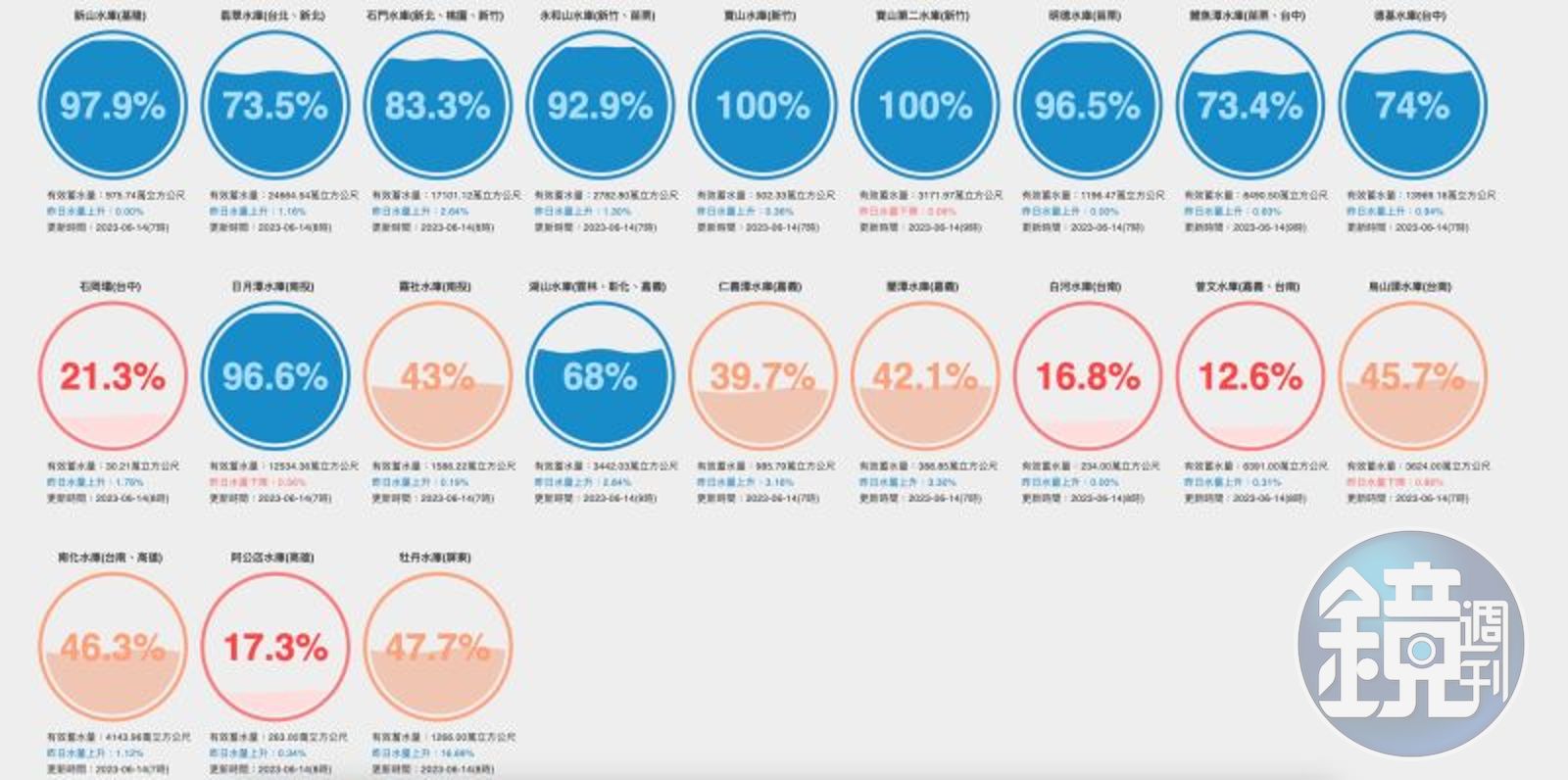 「台灣颱風論壇|天氣特急」粉絲專頁表示,本週第一波降雨暫時告一段落,總結第一波降雨情形,雨都有下對地方,北、中部的水庫都快喝飽了 ,包含新山水庫、寶山水庫、明德水庫、日月潭水庫都達到95%以上至100%的儲水量,中部地區則僅剩下德基水庫74%較低。
