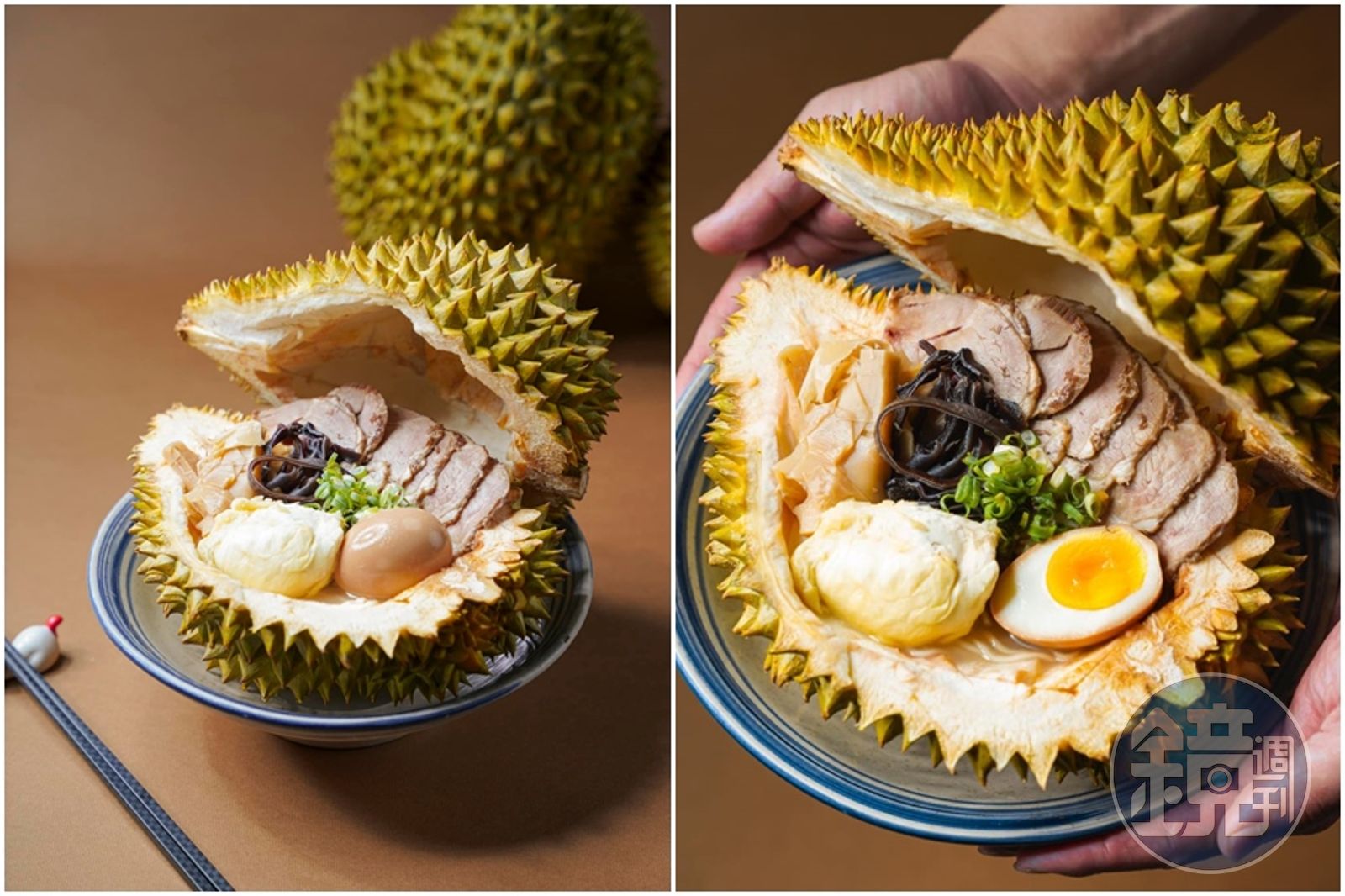 業者表示,「榴槤拉麵」以椰奶豚骨作為拉麵湯底,再把新鮮的榴槤果肉打成泥融入湯底,並且加入荸薺、白蘿蔔、蘋果、馬鈴薯、香茅增加湯頭的層次感,加上Q彈的博多細麵,最後再加入叉燒、溏心蛋、筍乾及新鮮榴槤果肉,整碗拉麵直接用榴槤殼端上,畫面超級震撼。