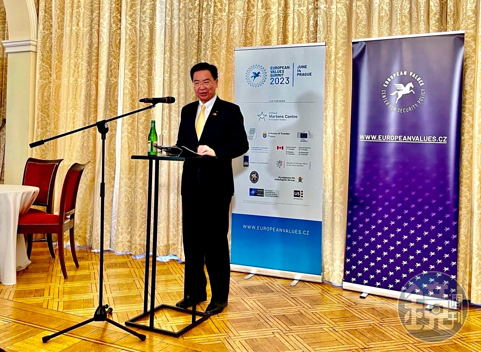 台灣外交部長吳釗燮深表榮幸,能夠在任內二度受邀訪問捷克,感謝捷克的禮遇接待,也非常珍惜與共享自由、民主、人權價值的國際友人共聚交流的機會。接著吳釗燮談及歐洲正深陷戰爭的衝擊,譴責俄羅斯對烏克蘭的侵略嚴重違反人權價值、聯合國憲章和平解決爭端的基本原則,對烏克蘭與歐洲國家帶來巨大的損失與傷痛。