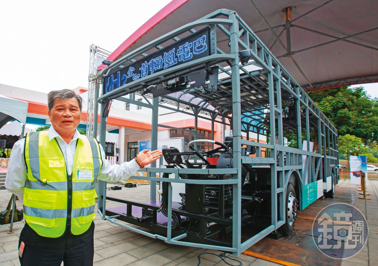 5月12日,高雄高科大產業創新園區萬頭攢動,由彩碤新能源、研華等台廠聯手打造,自製率將近6成的氫能巴士裸車原型車,吸引上百名產官學研專家齊聚一堂,一睹台灣氫能巴士的風采。有別純電動車在底盤擺放一顆顆電池,此輛氫能巴士是在車頂放置4管細長如瓦斯桶的氫瓶,顛覆各界想像。
