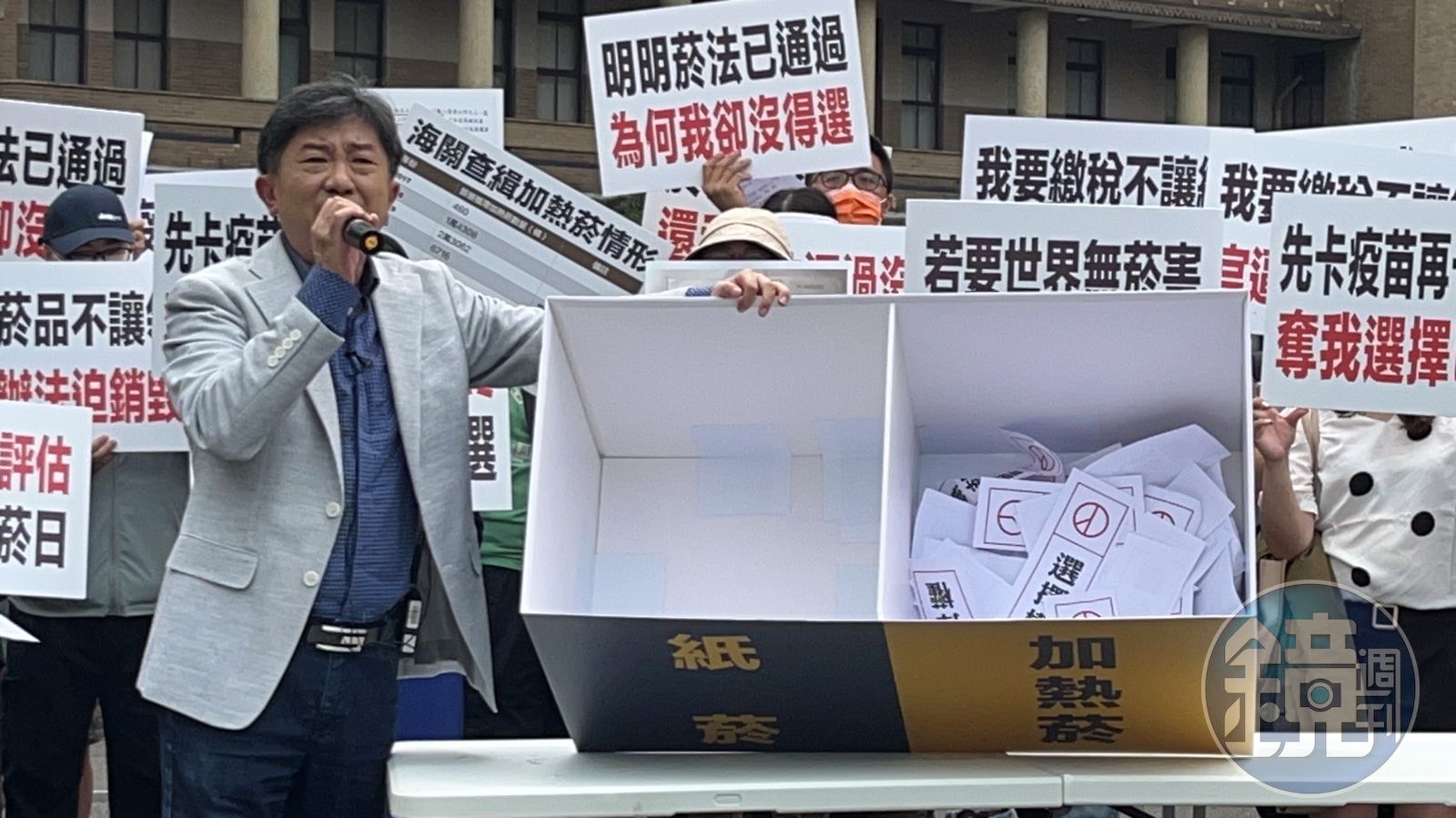 新版《菸防法》於今年3月22日正式上路,開放納管加熱菸,但民眾根本買不到,若從國外帶回加熱菸被海關查獲,會被裁處罰鍰,根本是阻斷民主國家民眾應有的選擇權;資深媒體人彭華幹因此在網路發起「還我選擇權,不要逼我抽紙菸!」運動,100多名支持群眾聚集在行政院前大唱《剉冰進行曲》,向院長陳建仁、副院長鄭文燦抗議選擇權被剝奪!