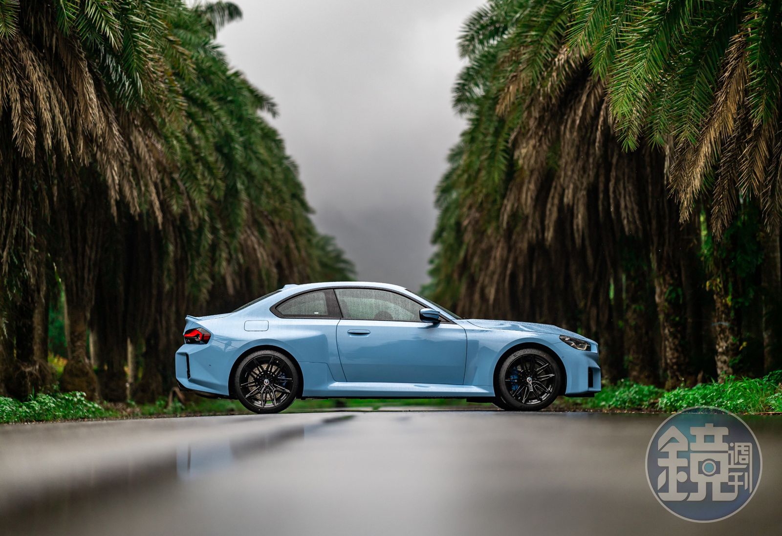 全新BMW M2以性能導向的大膽造型融合設計,展現出運動感十足的風格。尺寸俐落短捷的車身和寬闊的外觀造型使其與眾不同。無邊框的雙腎型M橫柵式水箱護罩、大面積的下氣壩和兩側進氣口提供最佳冷卻和空氣力學平衡,矩形設計向經典的BMW 2002致敬。特別的M Zandvoort Blue車色突顯其運動化外觀的熱血氣息。
