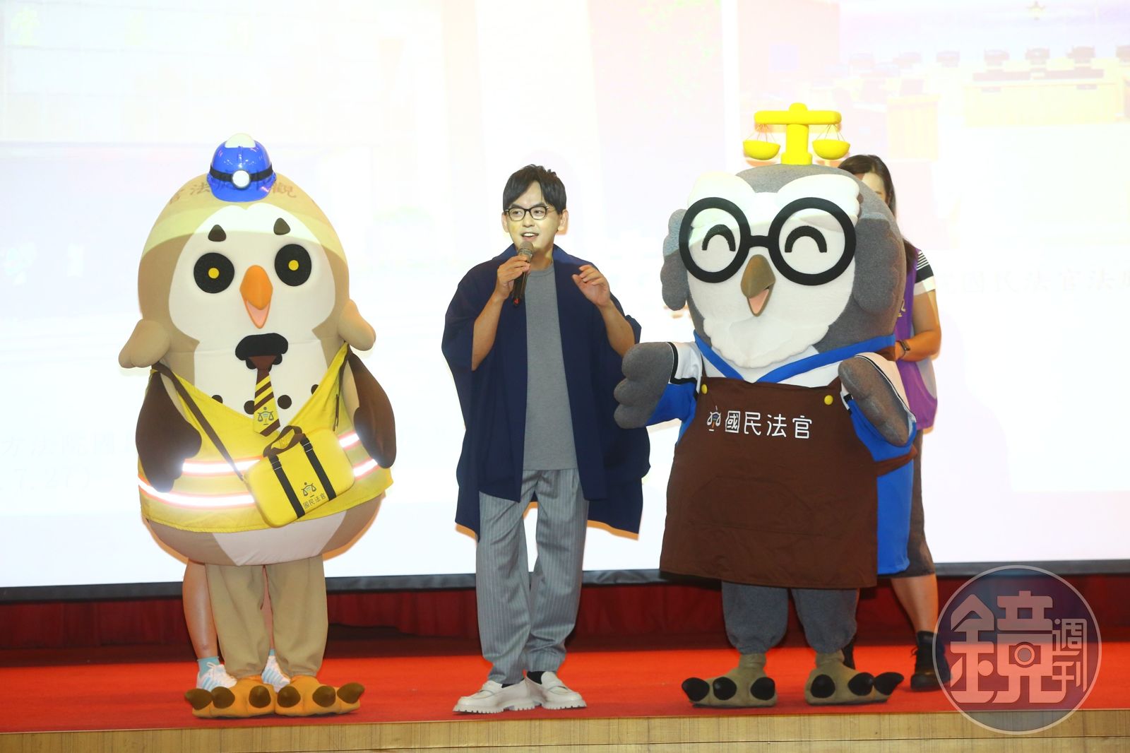 當時黃子佼表示,希望透過活動,讓大家共同參與國民法官,他對國民法官吉祥物也如數家珍,熱情跟現場來賓介紹兩隻吉祥物背景,喬治Judge代表職業法官,希多士Citizen是國民法官,一隻貓頭鷹,一隻草鴞,都是貓頭鷹家族,寓意職業法官跟國民法官都需要耳聰目明、明察秋毫,一起參與審判做出符合普世價值的判決。