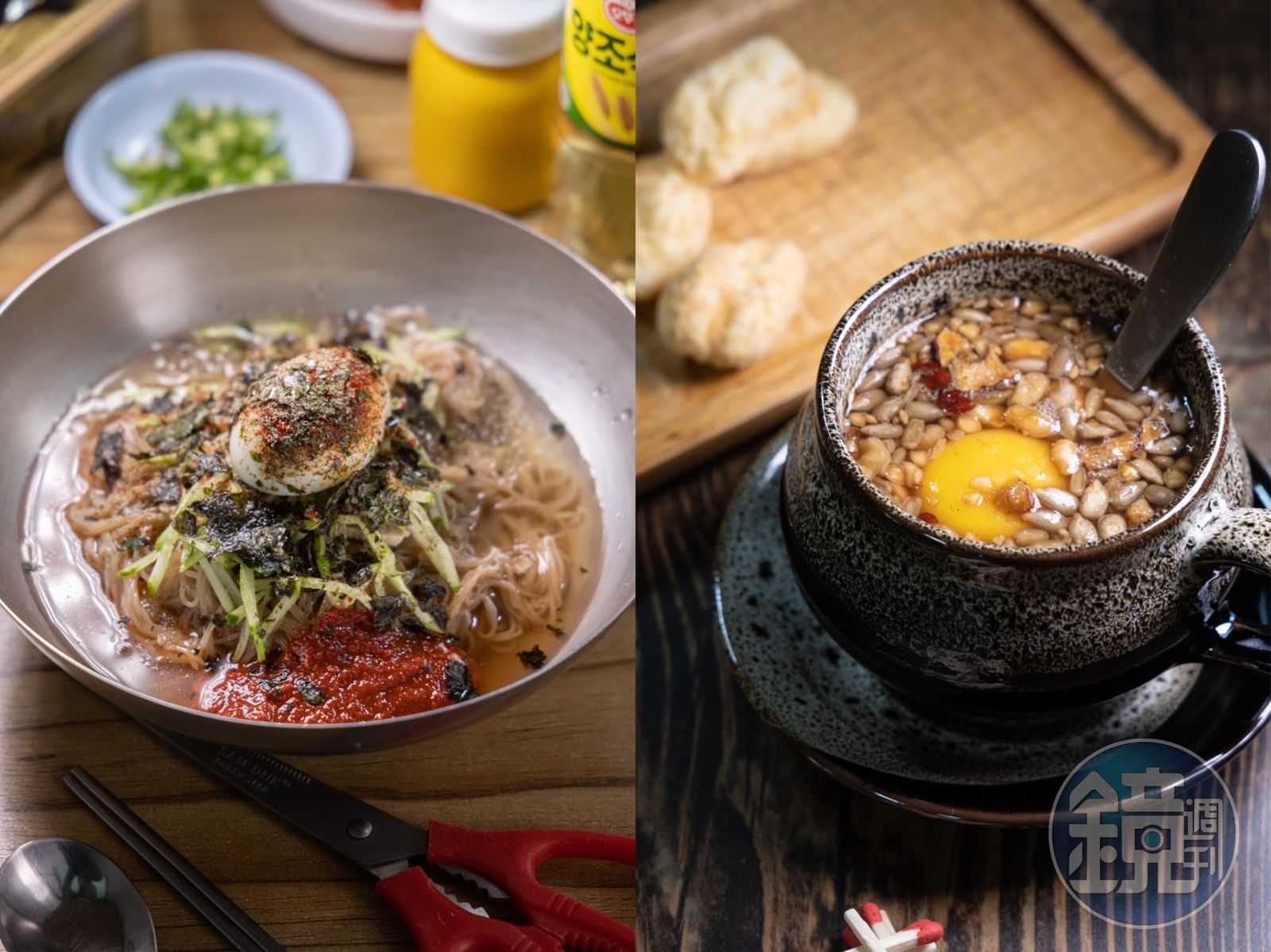 「湯飯」和「黃海道式冷麵」」是大豐食堂的必點品項,湯飯將豬內臟和血腸都處理得乾淨漂亮,毫無腥味,平常少吃內臟的人也能大快朵頤。單獨嘗過風味濃郁的辣湯,再將白飯舀進辣湯中,稀哩呼嚕一起入口,真是香辣爽快。分成乾、湯兩款的冷麵,獨特之處在於用了黃海道的傳統熬湯做法,以大量蔬果將湯體熬出清甜味,搭配酸甜適中的拌醬與彈牙有勁的麵條,涮嘴又無負擔,濕黏的夏日真的適合每天來一碗!