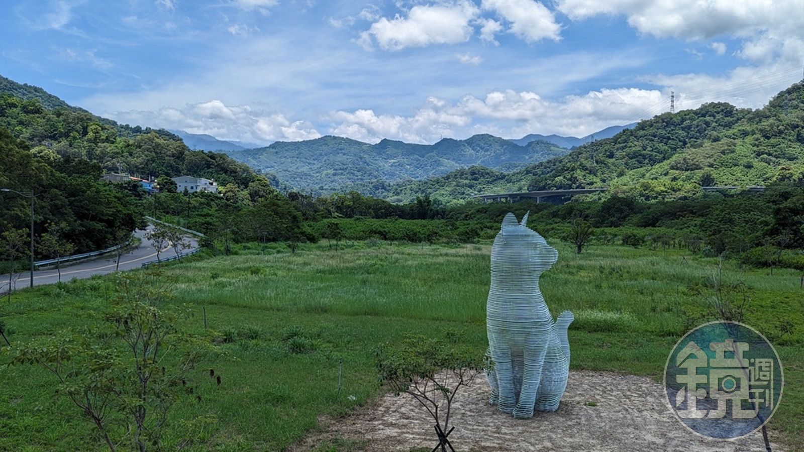 同樣於客家文學花園戶外的作品《望鄉》由台灣藝術家廖建忠所創作。一隻純白色的石虎站立於草坪上,視線遙望遠山棲地,訴說在快速發展的現今社會,目前分布範圍僅剩台灣中部淺山的石虎面臨生存危機。石虎的身體以虛線構成,好似能隱沒於山林間,天黑時身體螢光漆特殊材質因白天吸收陽光而能發出微光,有如精靈般的召喚淺山動物們回家之途。