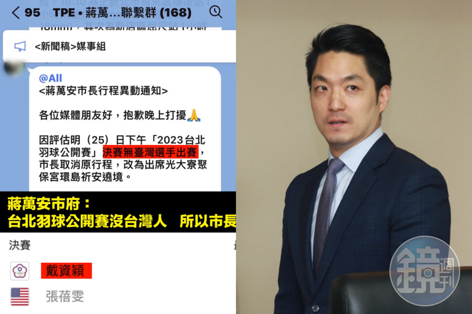 顏若芳強調,「台北羽球公開賽」是我國最高等級的羽球賽事,更是世界排名賽的重要一站、台北促進運動外交的好機會,蔣萬安身為地主與主辦單位,以「沒有台灣選手」而不出席決賽,卻能與其他總統參選人同台,「時間到底怎麼分配的?整個市府到底是在裝傻還是在說謊?」