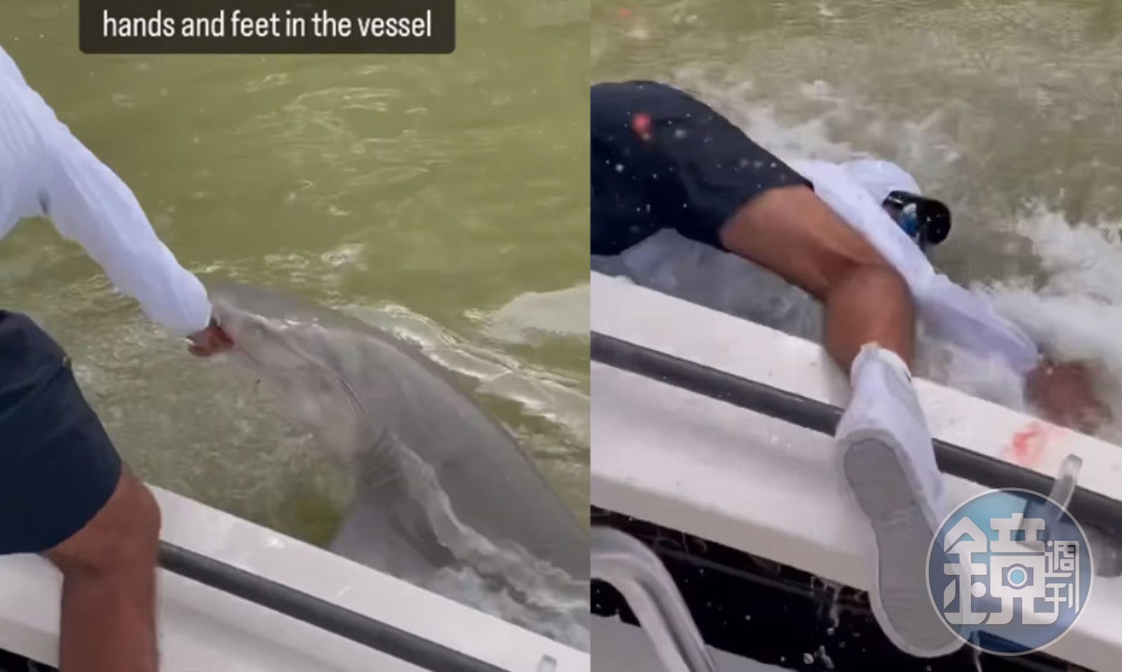 影片中可以看到男子瞬間被鯊魚拉扯後失去平衡,整個人頭朝下栽進水裡,雖然鯊魚很快就鬆口放開了他的手,男子掙扎試圖爬回船上,在船身留下一個血紅掌印。同行的其他人見狀趕緊大聲呼救「拉他上來、拉他上來」,最後才合力將他救回船上,躲過鯊魚後續的攻擊。