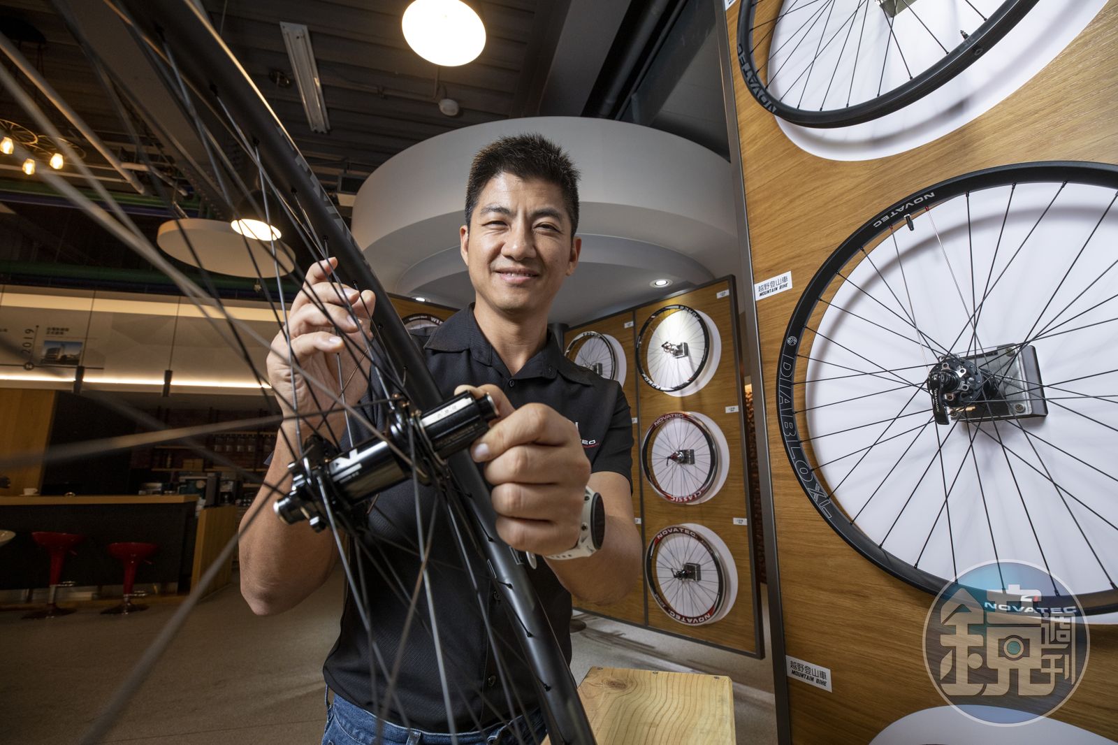 45歲的陳松君一身制服配牛仔褲,沒有老闆的距離感,因常騎單車,幾乎沒有贅肉。談及去年下半年開始,因烏俄戰爭、全球通膨,歐美自行車界景氣低迷,需求急凍,已興櫃的久裕興也延緩上櫃時程,但運動的人不悲觀,趁這時間升級品牌,推出高階產品線「NOVATEC Premium」,他自信地介紹:「我們把花鼓簡化結構,讓它精密度最高,重量最輕,強度又夠。」