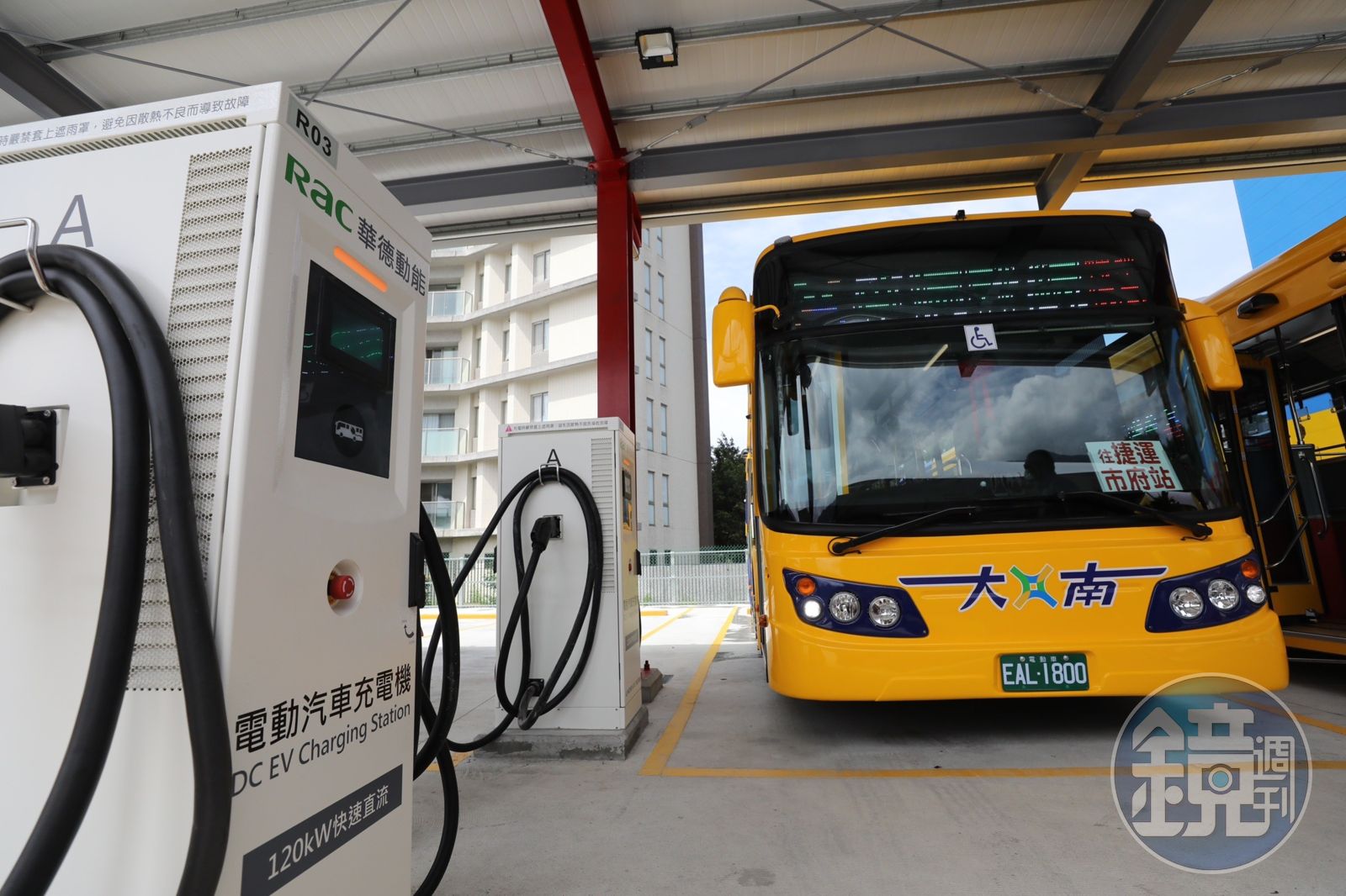 大南汽車全新建置的智能充電場站,由華德動能整體設計,年後開始承包施工,本月正式合法啟用。場站全區搭載太陽能板、120kW CCS1雙槍充電機、儲能櫃及華德動能子公司銓鼎科技開發的充電智慧排程管理系統,可透過遠端電腦按個別車輛之所需里程、剩餘電量及排班自動運算來完成充電程序,不僅讓充電場站的台電契約容量有效降低至少35%,減少人工充電管理及基本電費支出。