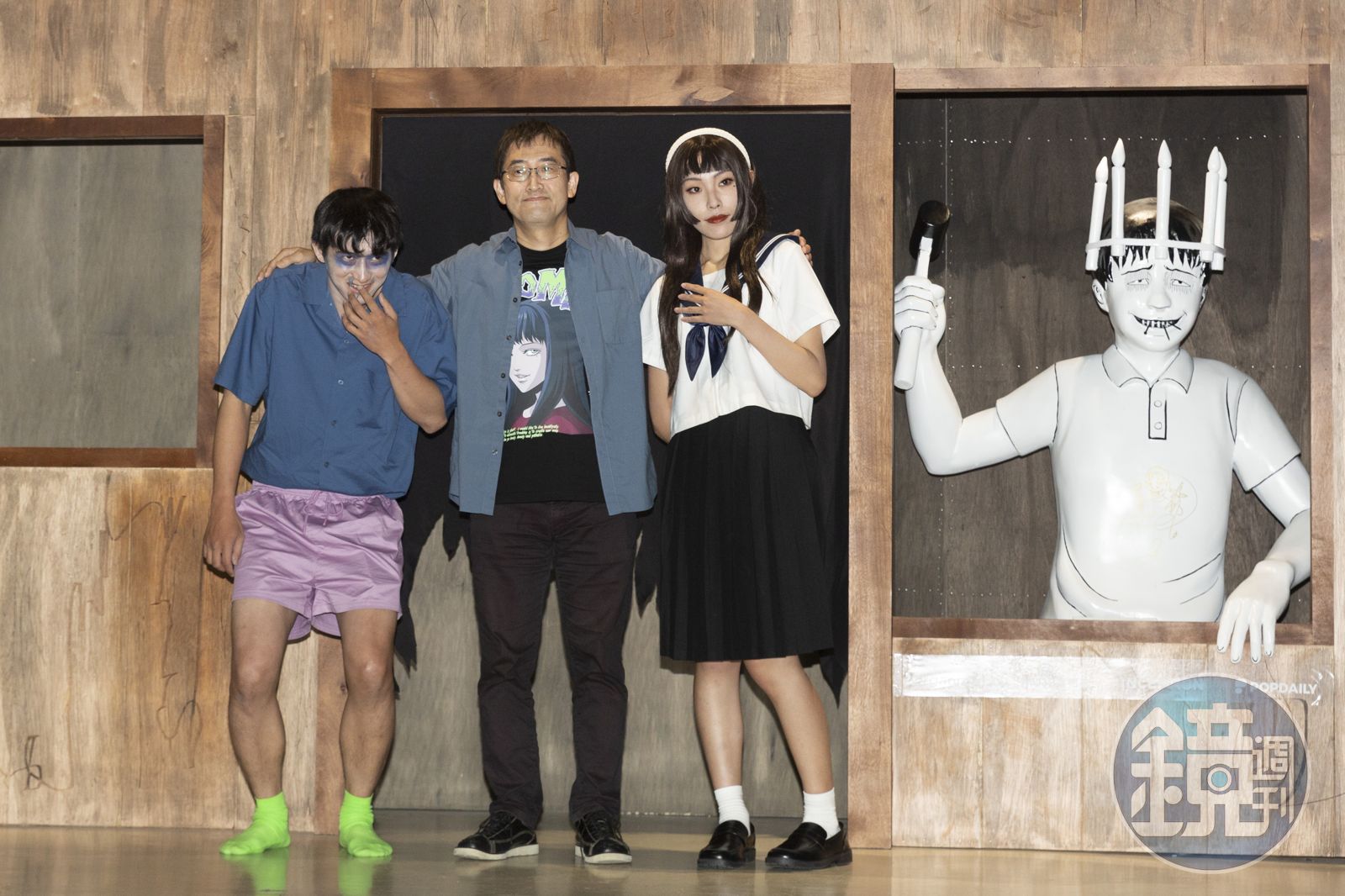 今天才剛到台灣的伊藤在記者會前已搶先體驗展覽,他笑說:「會不自覺地叫出聲,真的蠻恐怖的,裡面的演員演技也非常逼真,好像真的要撲過來一樣,感受到他們的那種氣勢。」他特別推薦台灣粉絲可以多看一下展區中的「人頭氣球」和以人體和木桶結合的大型漩渦裝置,直呼:「其實光從入場的地方就可以感受到可怕的氛圍!」