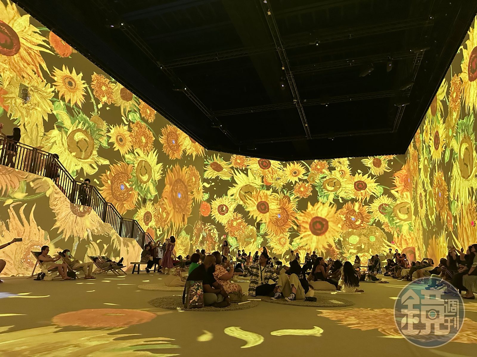 此系列展覽的核心亮點就屬「中央投影區」,從牆壁、地板到屋頂全方位零死角的大型數位投影,沈浸式營造氛圍,參展者可以席地而坐,也可以躺在躺椅、懶骨頭上,用最舒服的姿勢欣賞大作。有別其他特展,新加坡《梵谷藝術沉浸式體驗》特意將投影結合立體空間,在中央投影區展廳設置階梯,遊客走在投影中,穿梭虛實間,讓沈浸體驗更上層樓。