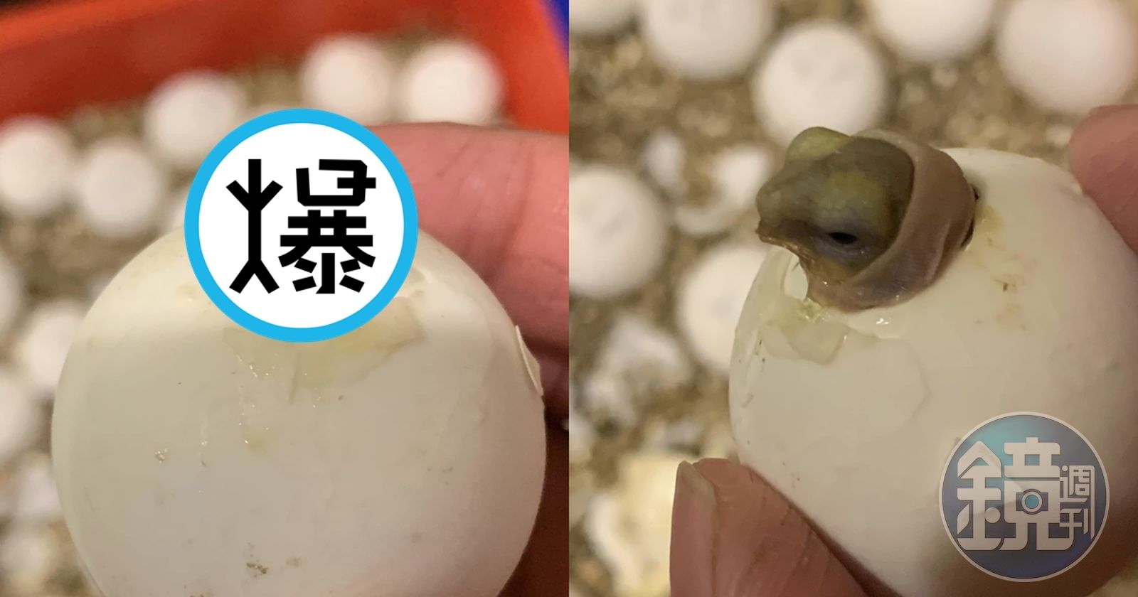「摸摸龜園」在臉書社團「有點毛毛的」分享3張照片,表示自家寵物是沒有毛的蘇卡達象龜,衝破蛋殼的模樣超級可愛。照片中可以看到數顆烏龜蛋,上頭寫著媽媽名字及下蛋日期,其中一顆蛋冒出了個小烏龜頭,該隻小龜只有頭在外面,頸部以下都還在蛋內,看起來就像卡住了,再搭配老成厭世的表情,相當逗趣。