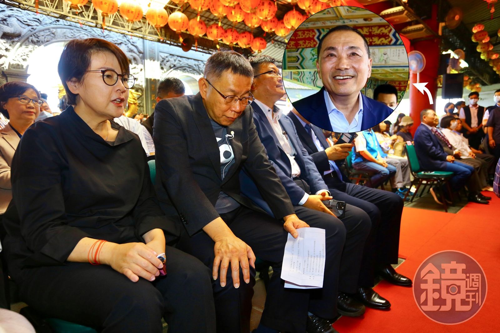柯文哲與侯友宜今在指南宮活動同場現身,民進黨總統參選人賴清德則因另有行程不克出席,總統蔡英文則是請行政院副院長鄭文燦代表到場。其中眾人最關注的還是代表民眾黨和國民黨參加總統大選的柯文哲與侯友宜,2人去年還曾以雙北市長身分同台主持會議,如今成了大選競爭者,日前甚至為了新北捷運規畫以及九二共識、兵役延長等選戰議題隔空槓上。