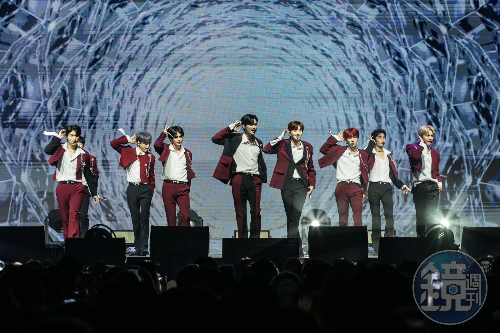CRAVITY以強勁舞蹈一連唱跳3首歌熱力開場,散發青春活力的他們一出場就讓台下LUVITY們嗨到不行,9位團員更在打招呼時狂秀中文,不僅用中文介紹自己名字外,更用中文甜撩台粉,其中隊長世琳高喊「我很想你們!」,還用台語跟台下粉絲說「我愛你」,頓時全場粉絲尖叫聲掀翻台大體育館屋頂。