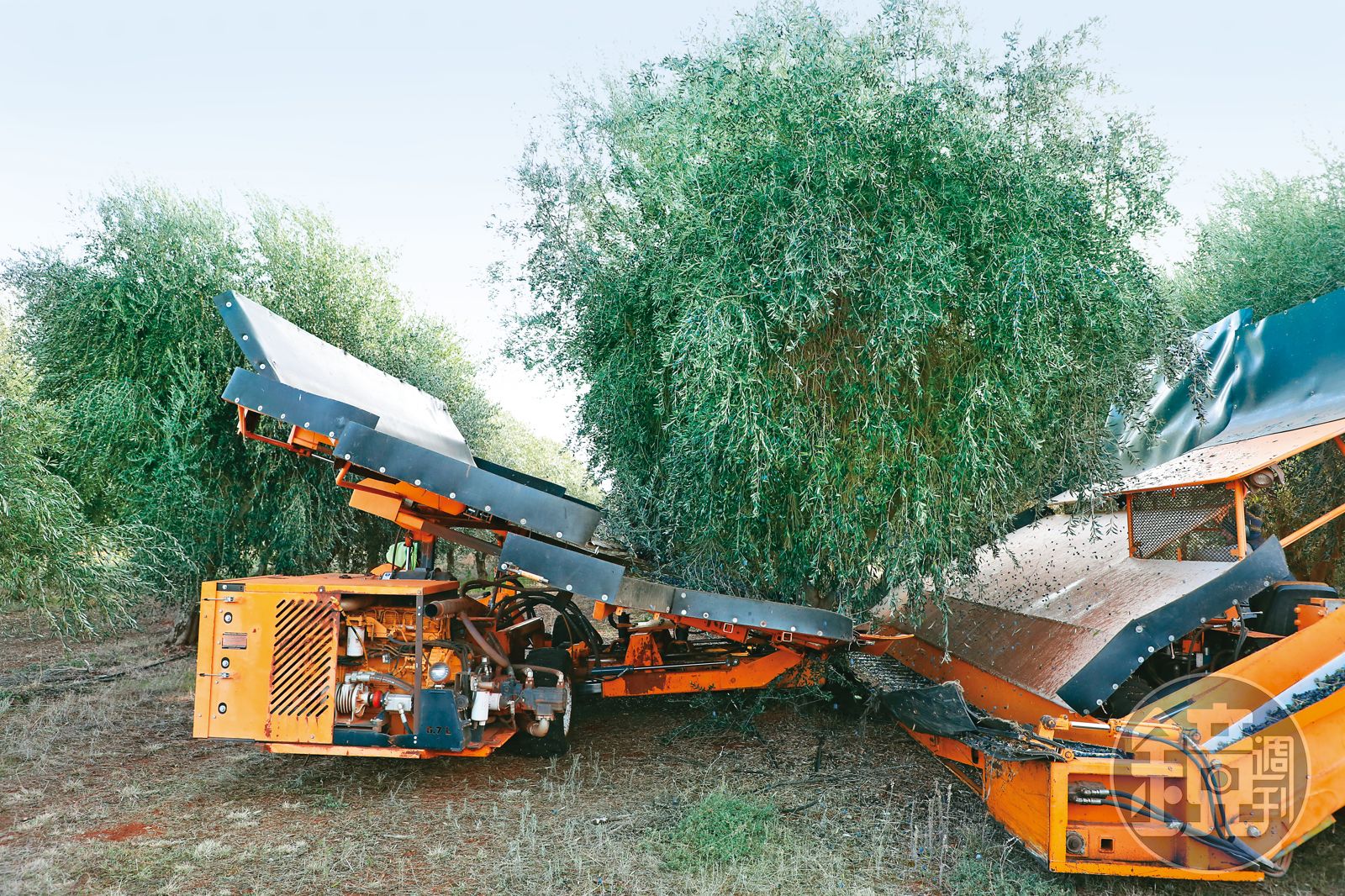 第一次近距離看橄欖採收,感覺十分新奇。澳洲因為人工昂貴,幾乎全用機器操作,兩輛車一前一後推進橄欖園中,就定位便開始撞擊樹幹,力道不輕不重,是剛好可把樹上的橄欖搖下來的程度,且每次只能搖兩分鐘。