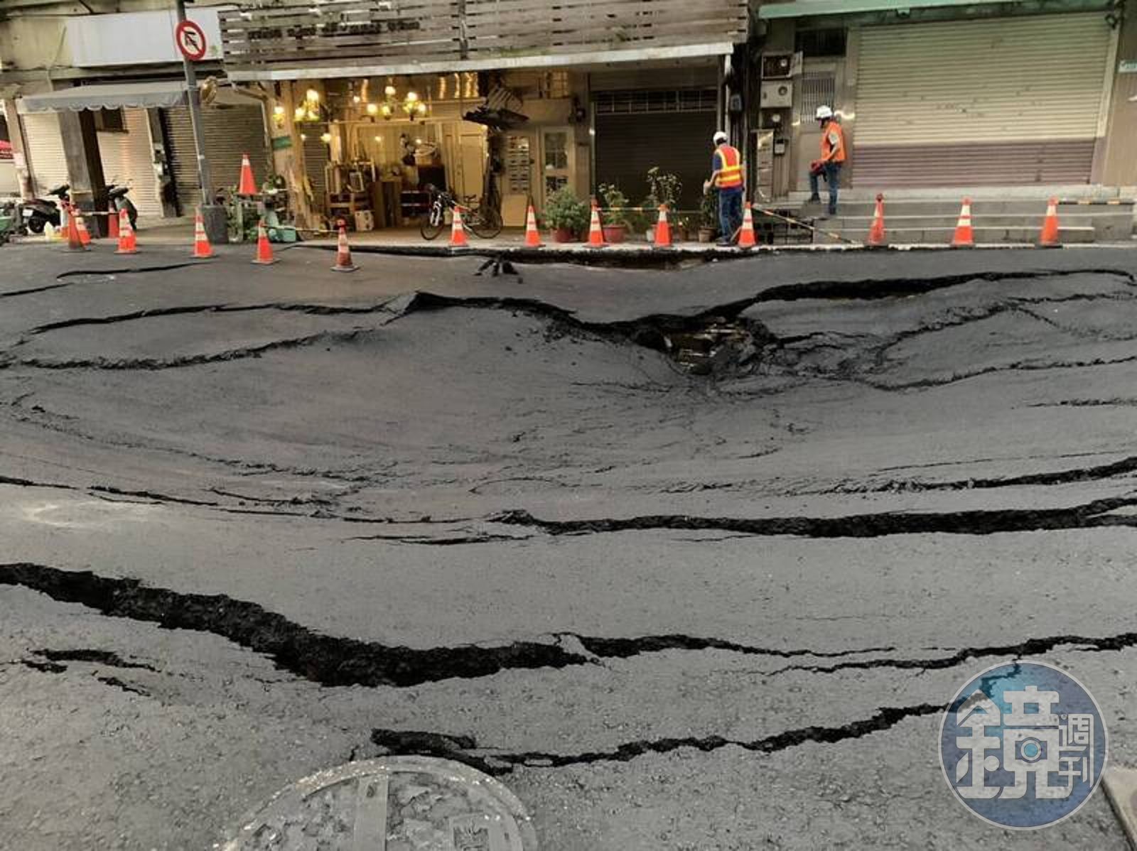 南京西路311號前的柏油路面今凌晨又發生坍陷的狀況,市府今緊急封閉雙向車道搶修。(台北市議員陳怡君提供)發布時間:2023.07.10 08:53 臺北時間