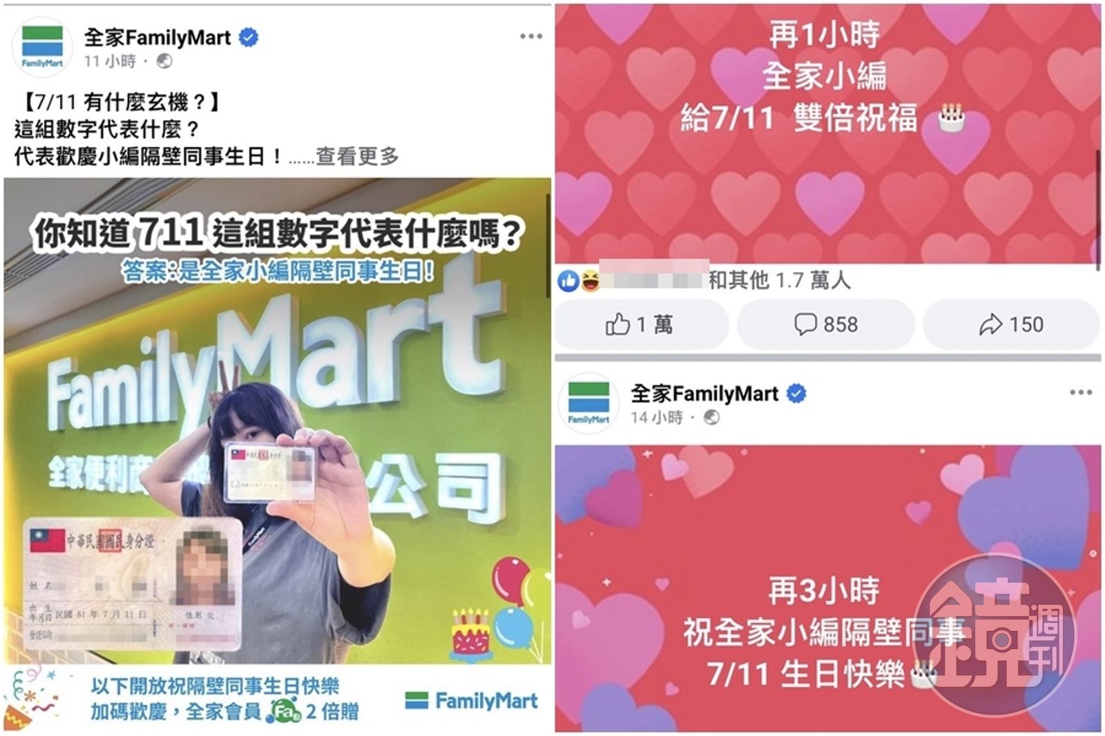 「全家FamilyMart」臉書粉專昨晚故弄玄虛發文,「再3小時,祝全家小編隔壁同事7/11生日快樂」「再1小時全家小編給7/11雙倍祝福」,等到凌晨12:00一到,小編發圖文表示「你知道711這組數字化表什麼嗎?答案:是全家小編隔壁同事生日!」