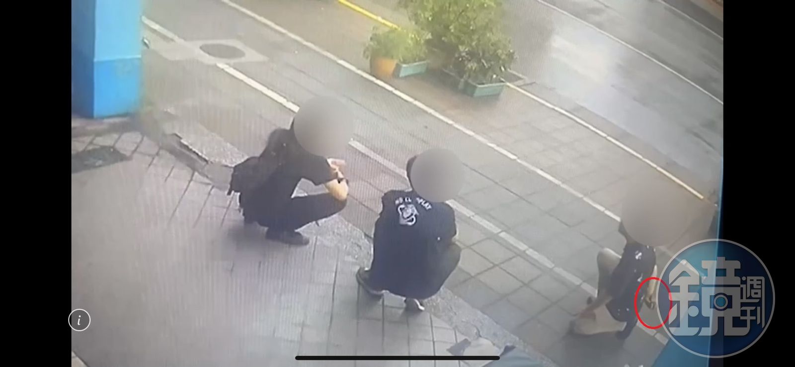 警方調閱監視器,發現外籍男子當時手拿磚頭藏在背後(紅圈)。(翻攝畫面)發布時間:2023.07.17 14:52 臺北時間
