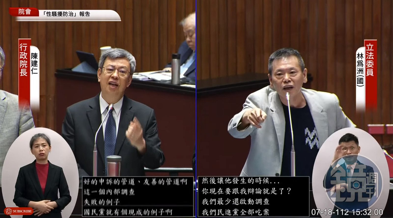 林為洲認為,修法應讓權勢性騷等案件可以很快有外部介入調查,陳建仁也回應表示,「內部調查失敗的例子,國民黨就有一個現成例子啊」,暗指傅崐萁、鄭正鈐的案件內部調查沒有結果,林為洲一聽氣得反問:「你現在是要跟我辯論嗎?」直嗆「我們至少有啟動調查,民進黨全部吃案!」陳建仁回道:「啟動調查的結果那被害人有沒有被很好的保護?」