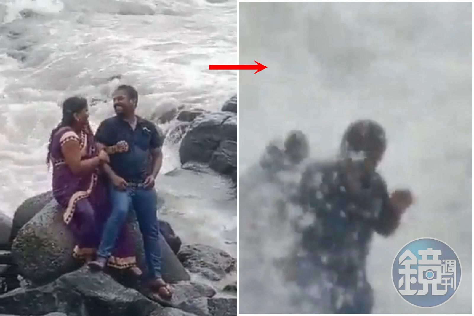 據英國《太陽報》報導,事發在本月9日,32歲的婦人索娜爾(Jyoti Sonar)和老公穆克許(Mukesh)帶著孩子們,到孟買的班卓拉(Bandra)海岸邊遊玩,隨後索娜爾和穆克許直接到海邊的岩石上,準備合影。從民眾拍攝的影片可見,當時現場風浪很大,但索娜爾夫婦為了自拍美景,不惜生命危險坐在岩石上。只見大浪一波又一波打來,但索娜爾夫婦完全不在意,堅持繼續拍攝,但下一秒,一波更大的瘋狗浪打來,這時把索娜爾夫婦全部捲入海中,孩子們也不斷在岸上大叫「媽媽、媽媽」。