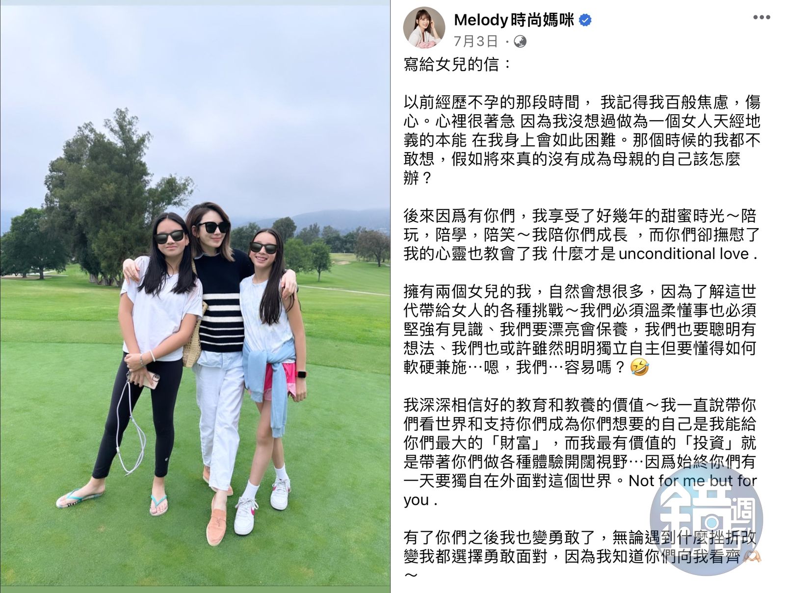「日子是自己在過,冷暖自知」、「始終還是來到了一個盡頭」,Melody於7月7日聲明離婚之時如此說道;其實7月3日在她寫給女兒的信中,也可窺知前夫已不在生活重心中了。
