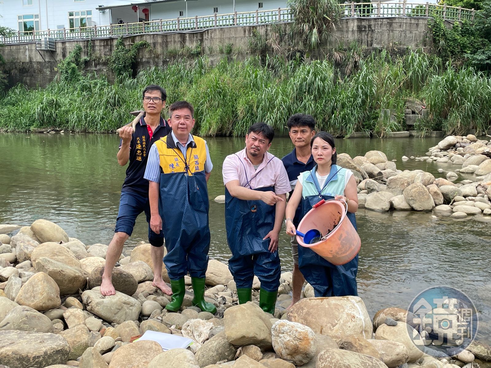 洪申翰、詹紀緹與鎮長陳光彩18日中午,穿著青蛙裝(下水褲),涉水到鄰近艾斯巴達公司廢液排放口的汙染點,用鏟子挖出底泥,實際下水採樣。洪申翰說,光在岸邊,就能聞到類似塑膠的臭味,等到涉溪走到有毒溶液洩漏的邊坡下,稍微用鏟子翻攪河床泥土,馬上聞到一股非常濃烈的化學臭味,令人作嘔。