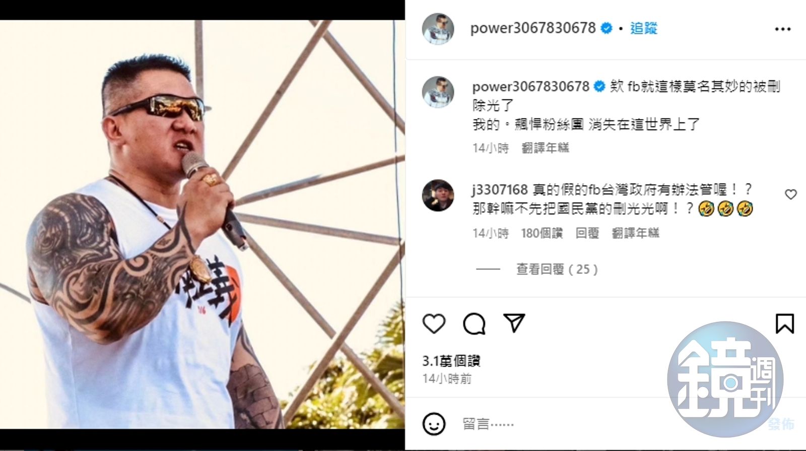 網紅「館長」陳之漢日前才與前立委黃國昌在凱道舉辦716大遊行,沒想到在18日晚上,館長在IG發文表示自己經營10年的臉書粉專無預警消失,「欸,fb就這樣莫名其妙的被刪除光了。我的,飆悍粉絲團 消失在這世界上了。」同時他也在YouTube社群發文表示,「沒有通知,完全被抹殺在網路上,真的很難過,畢竟很多值得紀念的照片都在上面。」更在直播時質疑此事是國家機器介入。