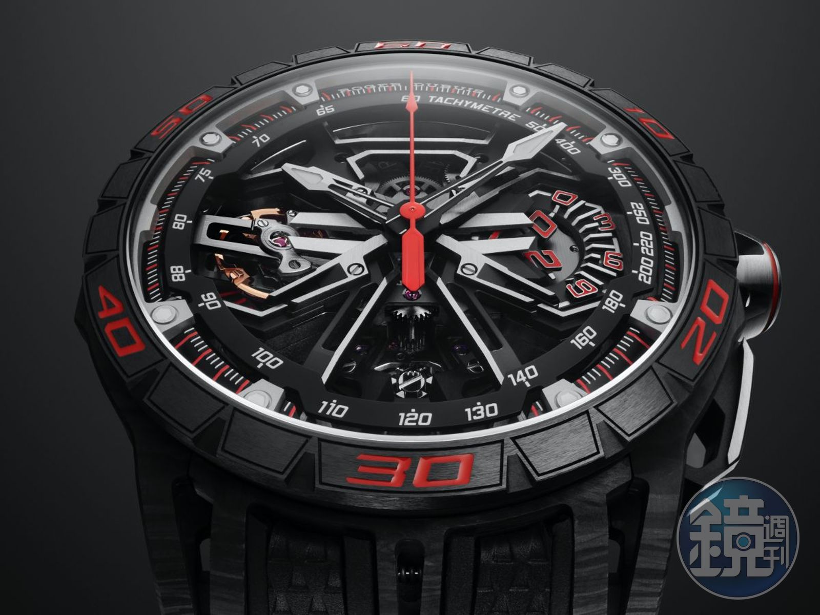 此錶設計受到超級跑車工程技術的影響,除了品牌本身就與義大利超跑品牌「藍寶堅尼」(Lamborghini)以及賽車輪胎製造商「倍耐力」(PIRELLI)有長期的合作,今年更擔任英國知名汽車盛會「古德伍德速度節」(Goodwood Festival of Speed)的官方計時。為此,ROGER DUBUIS火力全開,把最新設計都運用在這款特殊錶款之上。