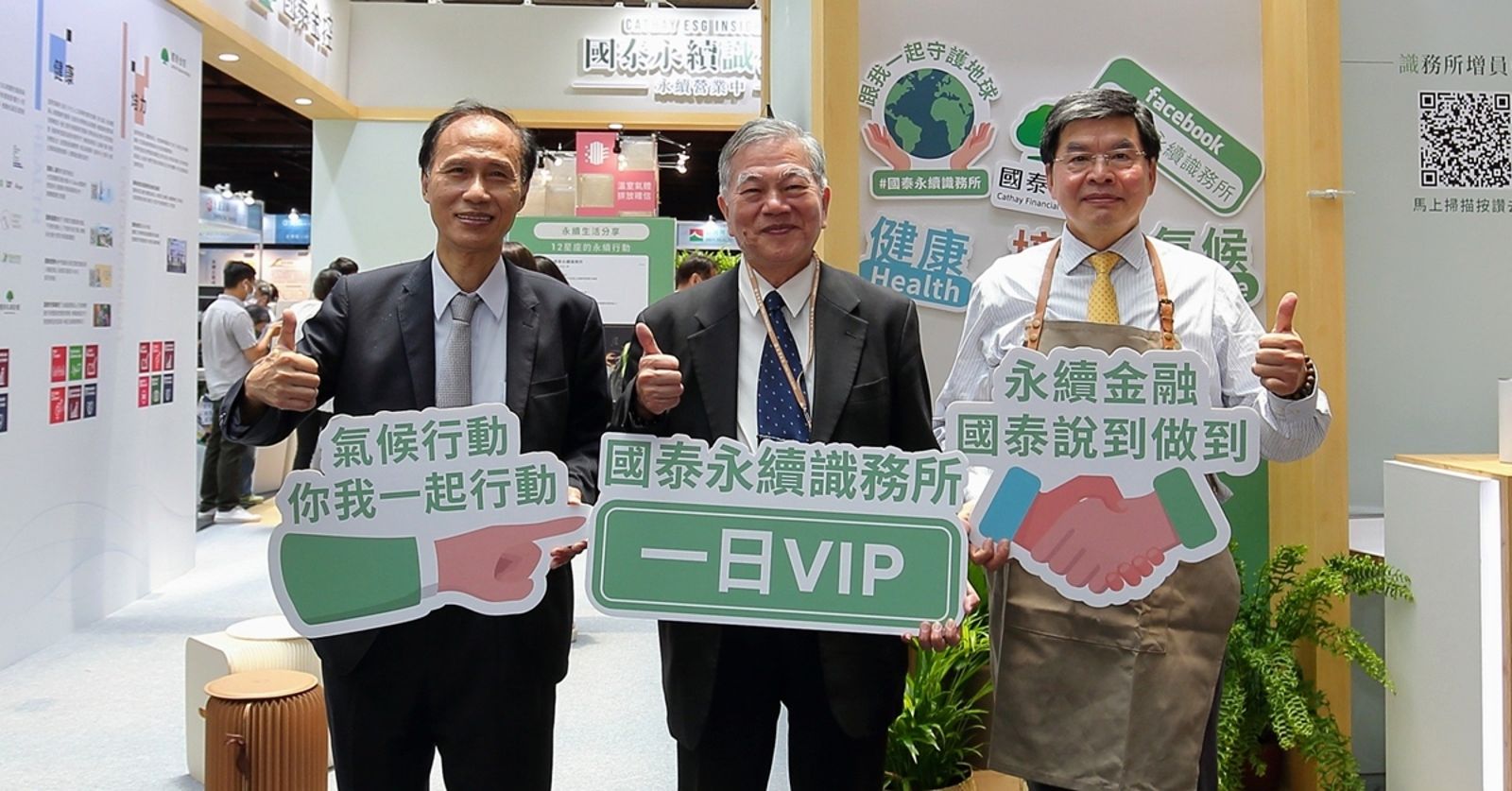 以國泰永續三大主軸「氣候、健康、培力」為主題設計闖關遊戲,讓民眾能了解國泰金控對於永續議題的實際作為,更能補充永續金融新知識。臺灣金控董事長沈榮津與總經理魏江霖於21日蒞臨國泰攤位,由國泰金控總經理李長庚接待參觀,分享國泰近年永續成果。