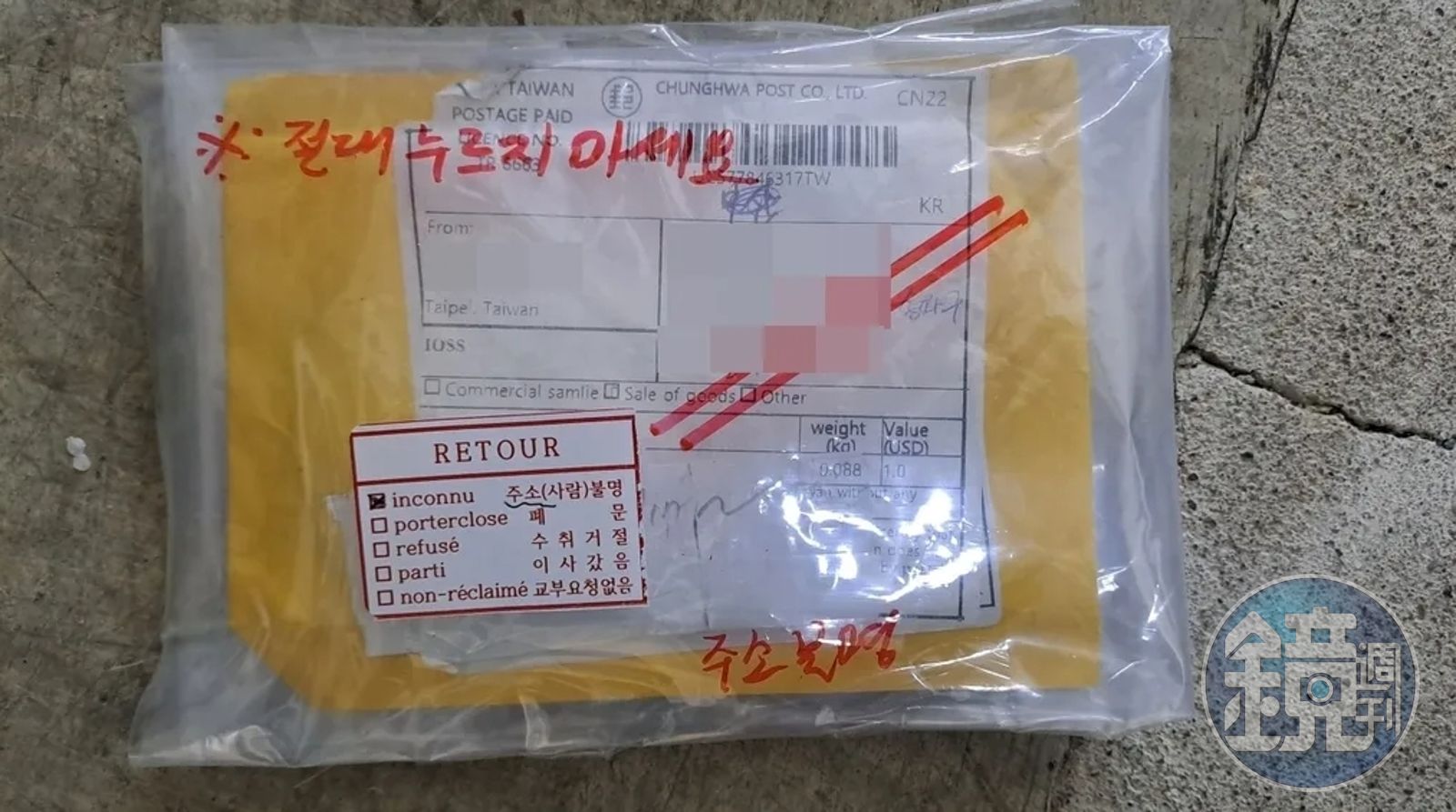韓媒轉述警方說法,提醒民眾注意收取,寫著「CHUNGHWA POST,來自P.O.Box 100561-003777, Taipei Taiwan」的黃色或黑色包裝國際包裹。