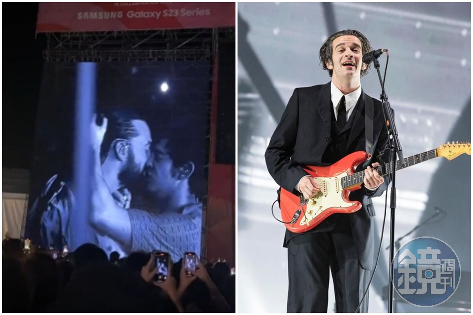 隨後,貝斯手羅斯走到馬蒂身旁,2人就在台上,當著粉絲、觀眾們面前上演火辣熱吻。