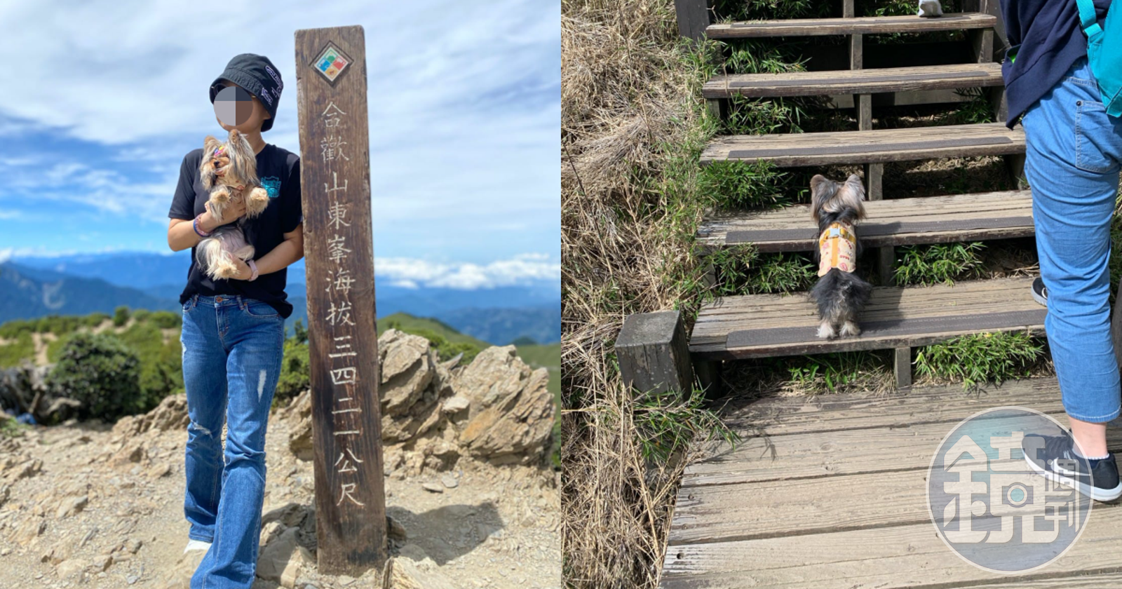 一名女飼主今日在臉書社團「有點毛毛的」發文,寫下「EMMA 的第一座百岳」,並附上多張照片,可以看到她帶寵物犬登上合歡山東峰,一人一犬開心合照,還有愛犬的獨照,而攀登過程似乎未牽繩。