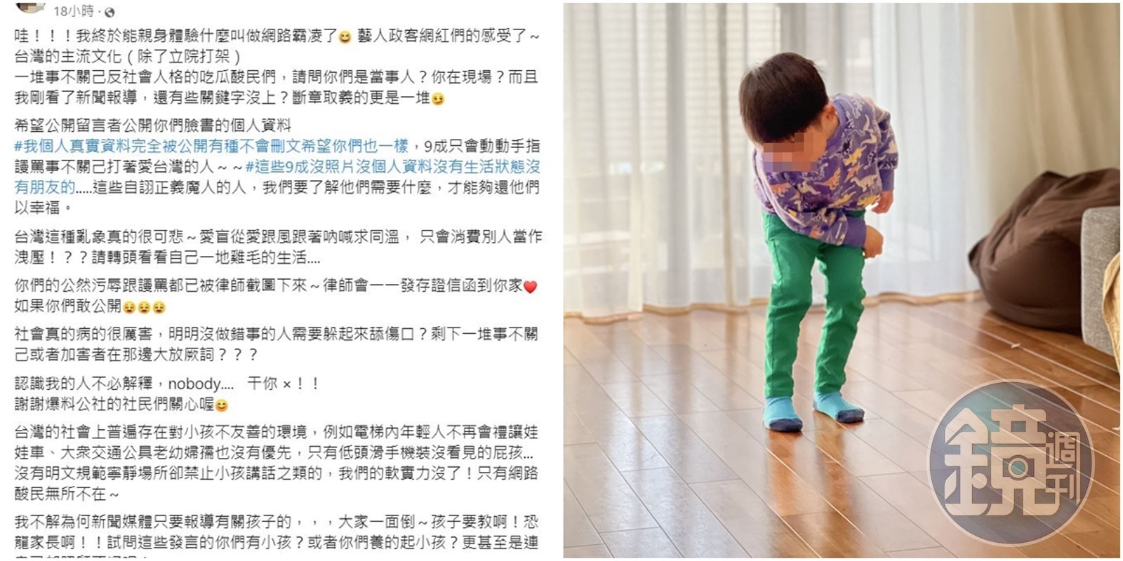 她也指出,「社會真的病的很厲害,明明沒做錯事的人需要躲起來舔傷口?剩下一堆事不關己或者加害者在那邊大放厥詞?」,台灣社會普遍存在對小孩不友善的環境,只要說到小孩,大家都一面倒覺得孩子要教、恐龍家長,她諷刺「請問發言的人有小孩嗎?養得起小孩嗎?」