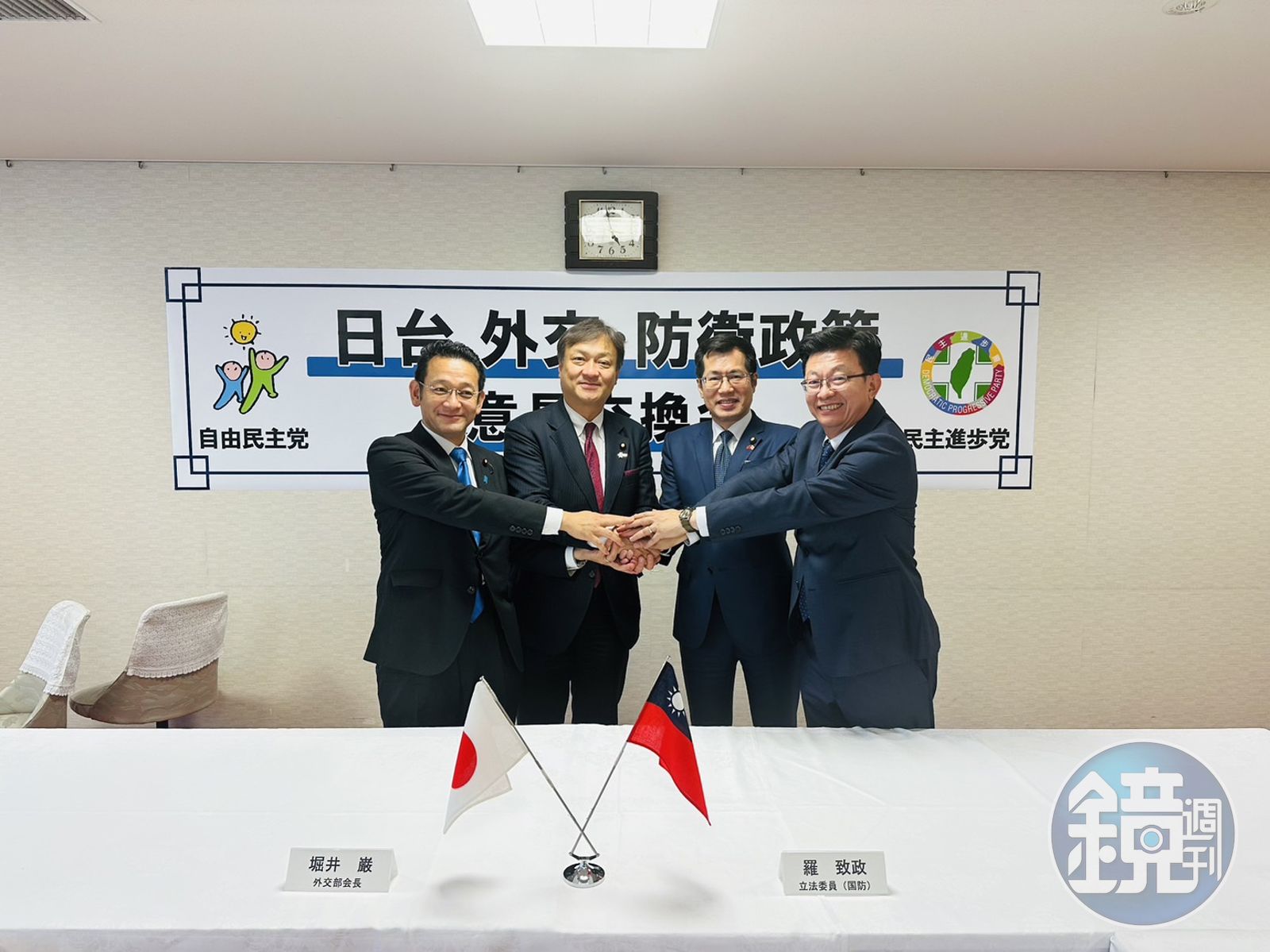 台日執政黨2+2會談這次首度在日本自民黨本部舉辦實體會,會議開始時,堀井巖用中文自我介紹,羅致政、郭國文則開玩笑說,這陣子東京天氣越來越熱,代表台日關係逐漸加溫。