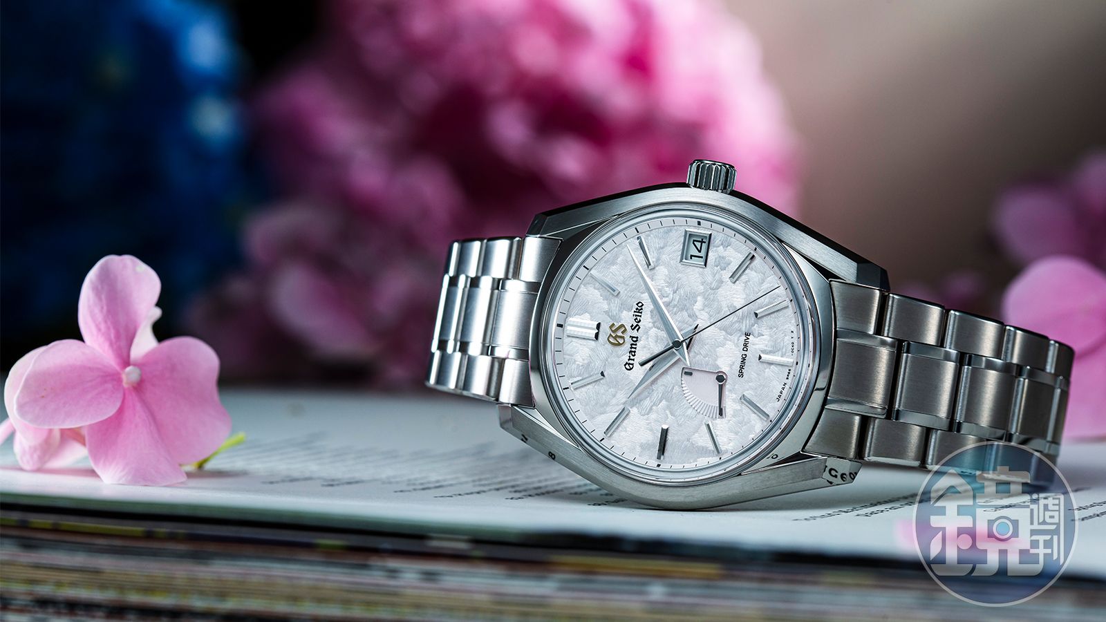 日本是四季分明的國家,也連帶造就出他們特色獨具的風土文物,而這些自然景觀也成為GS在製作面盤上的題庫,除了前面提到源自諏訪湖冬日結冰湖面的御神渡面盤,以二十四節氣為概念的主題也是很受歡迎的題材,例如SBGA413的春分櫻花面就是很討喜的一款。以春天時櫻花花瓣隨風飄落,墜下後浮在水面上形成的花筏景象為發想,而且GS還特別使用白鈦材質來呼應櫻花的輕盈感,特殊面盤的刷紋也做得比較淡,加上金色的GS Logo,用細節去織就櫻花意象的作法非常高明。