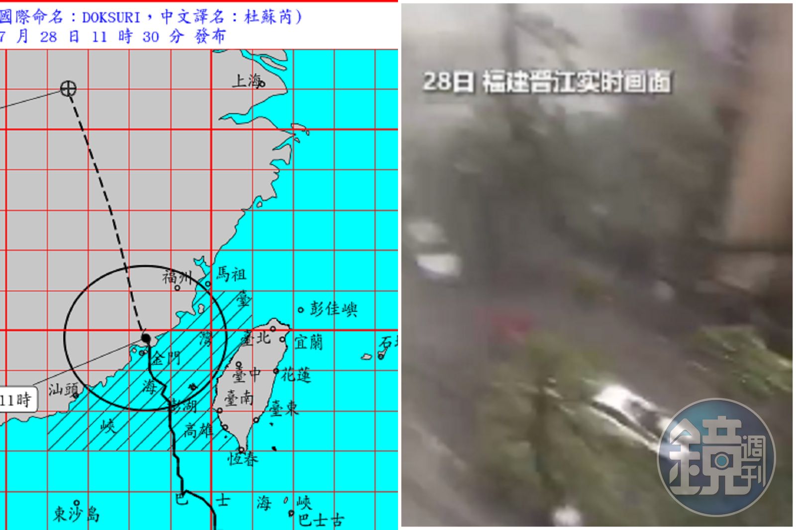 最新資料顯示,杜蘇芮在今(28日)11時的中心位置在北緯 24.8 度,東經 118.4 度,即在金門的北北東方約 40 公里之處,並以每小時30轉27公里速度,向北北西進行。目前杜蘇芮暴風圈已脫離台灣本島,但金門、澎湖仍在暴風範圍內,風雨持續中,預計此颱風強度有持續減弱趨勢,暴風半徑也有縮小的跡象。