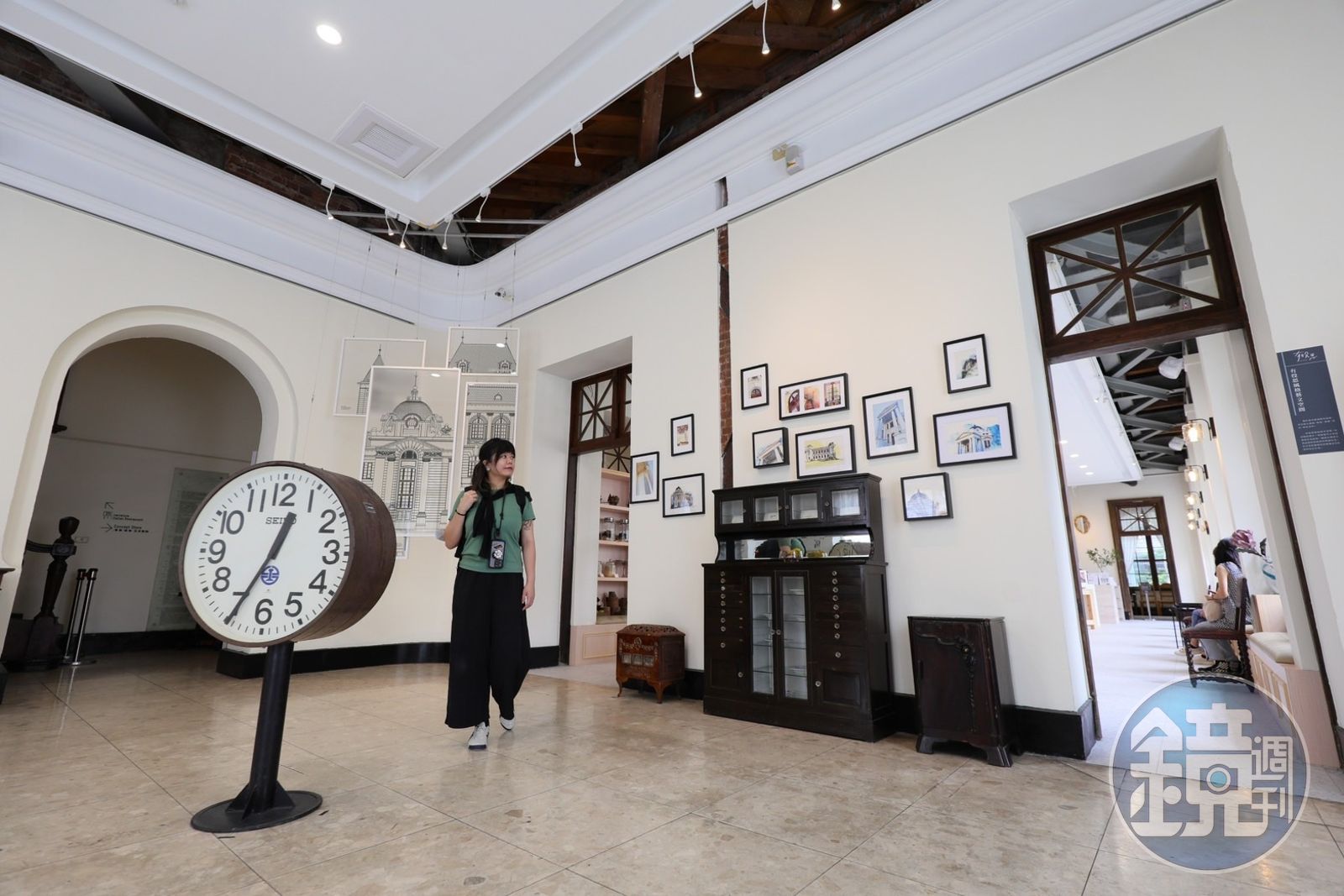 廳放置著來自台鐵的大時鐘、各式古董收藏,以及當地工作坊的手繪作品。如今「台中市役所」一樓被改造為書店兼選物的「有役思藝文空間」。 由於市役所二樓為餐廳,因此一樓的選物空間中也特意挑選了餐具、杯盤等產品。身處太陽餅之都,販售的選物中當然也包含著當地餅舖的糕點禮盒。除了選購喜歡的產品,有役思也是拍照零失誤的超棒空間,由於過往是辦公區域,建築師特別著重採光,陽光就這樣透過一面面拱窗輕柔的灑落室內,也難怪許多人拿了本書窩進閱讀區就捨不得離去。