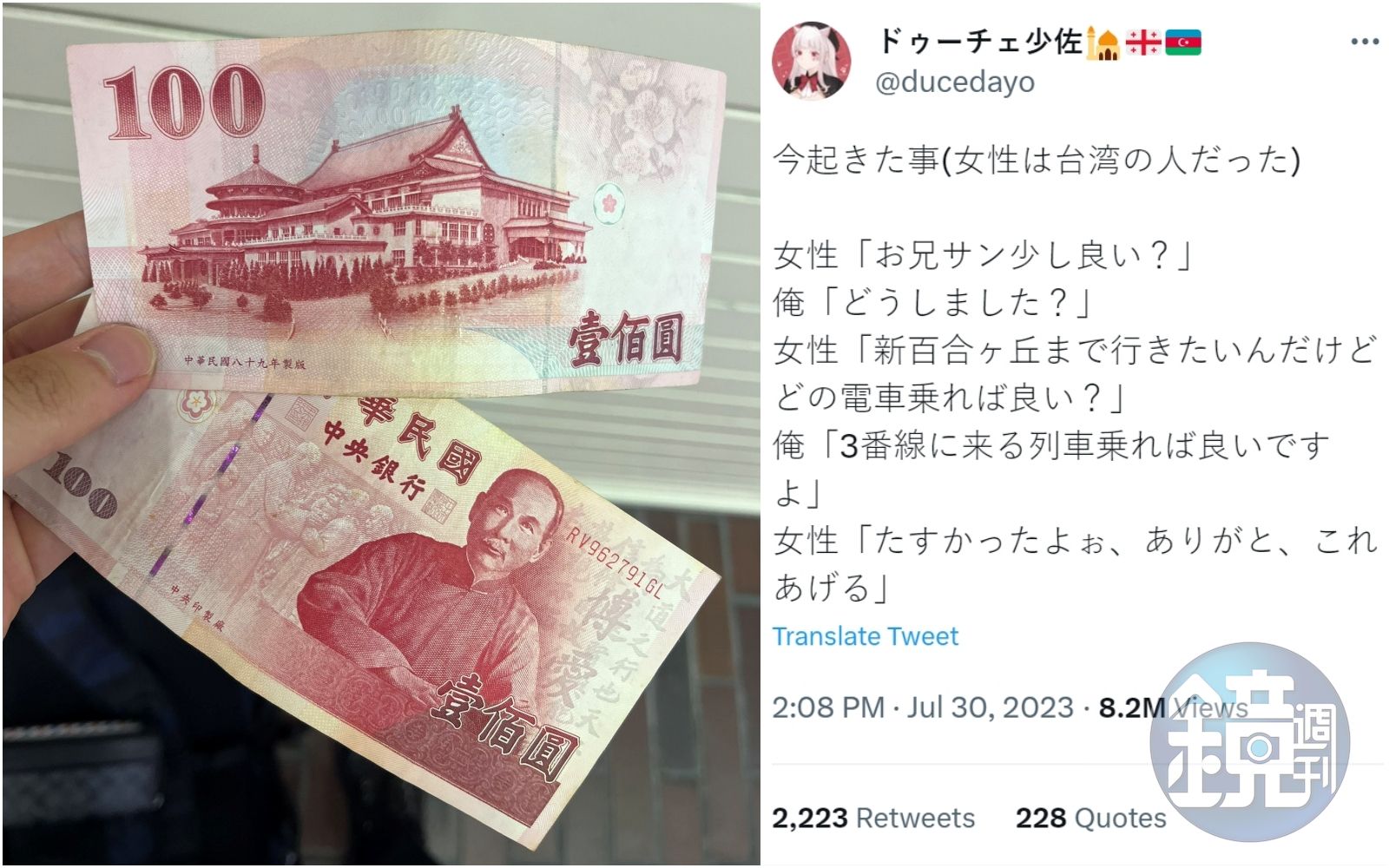 暱稱「ドゥーチェ少佐」的日本插畫X帳號,30日貼出2張新台幣100元鈔票,寫下他當天遇到的情況。他透露,一名來自台灣的女人向他搭話,詢問他如果要到新百合車站的該怎麼搭車,他則回答告訴女子,「搭三號月台的那班車就可以了」,女子則回:「得救了,謝謝你,這個給你。」