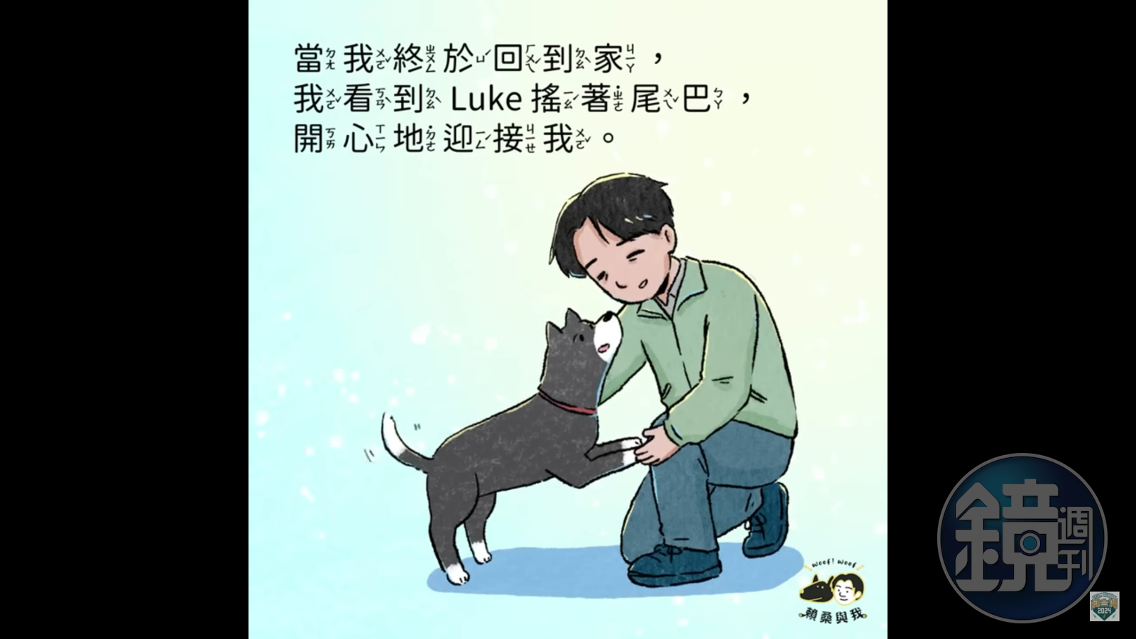當時外界只透過媒體報導,看到賴清德在維冠金龍大樓現場指揮的模樣,而今賴清德透過動畫片,描述了當時家中的景象。賴清德以旁白配音的方式表示,他記得當晚他趕著出門勘災,Luke一直蹲在家門口,「後來才知道,我離開多久,他就坐在那裡多久」。家人告訴賴清德,Luke有點不安,可能是需要陪伴。當賴終於回到家,Luke搖著尾巴開心地迎接他,「突然間,我的疲憊都消失了」。