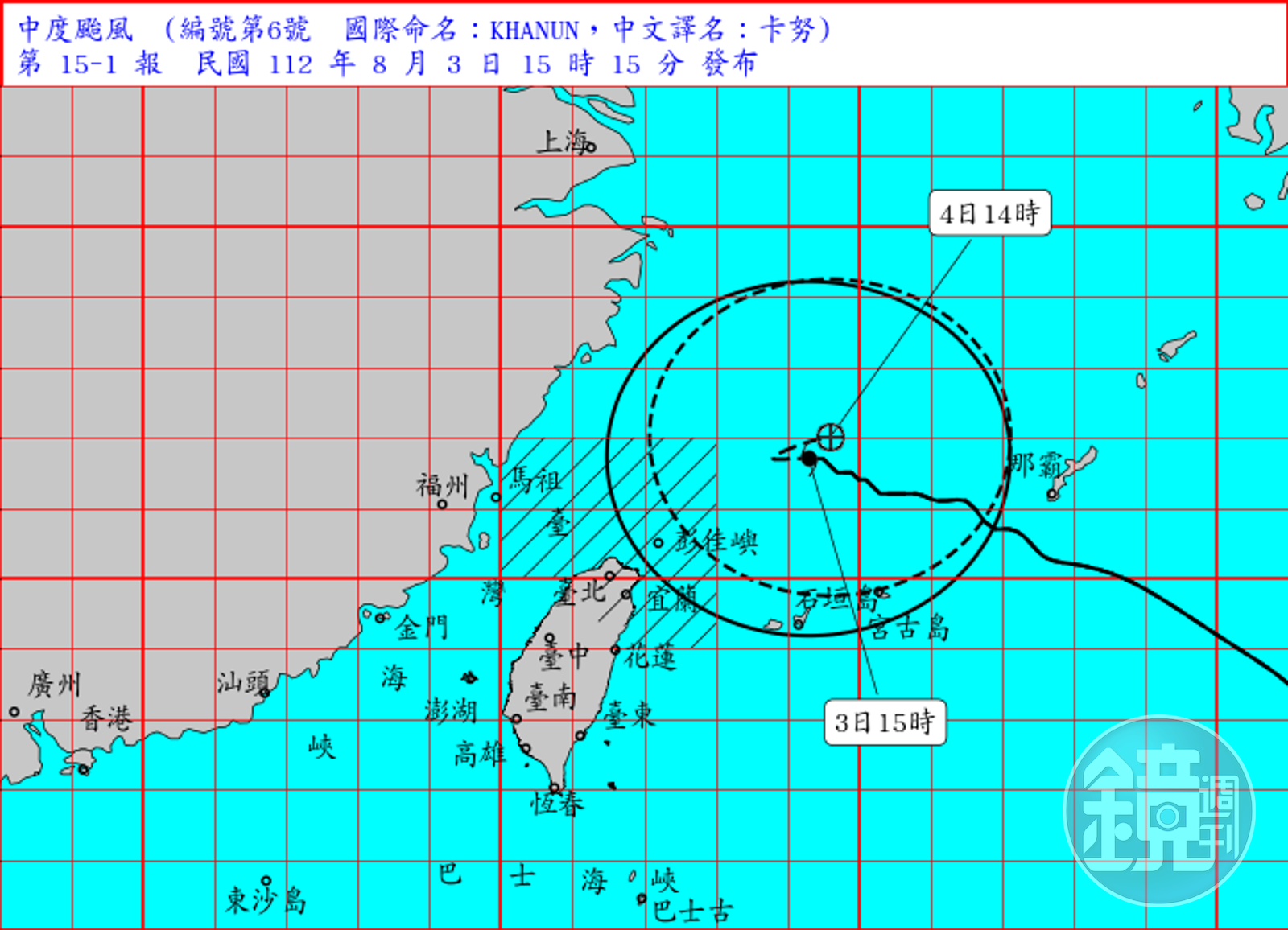 中央氣象局預報員徐仲毅14時40分於記者會指出,卡努颱風緩慢向西移動,預估今(3日)深夜到明(4日)凌晨最靠近台灣,今晚暴風圈將觸及東北角陸地,接著是基隆與台北,由於颱風移動慢觸陸時間可能延後,且路徑仍有不確定性,也有可能不觸陸。
