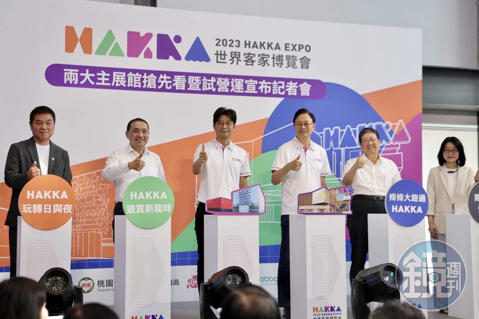 侯友宜出席客家博覽會試營運,與苗栗縣長鍾東錦(左一)等人同台。(侯友宜競選辦公室提供)發布時間:2023.08.04 17:44 臺北時間