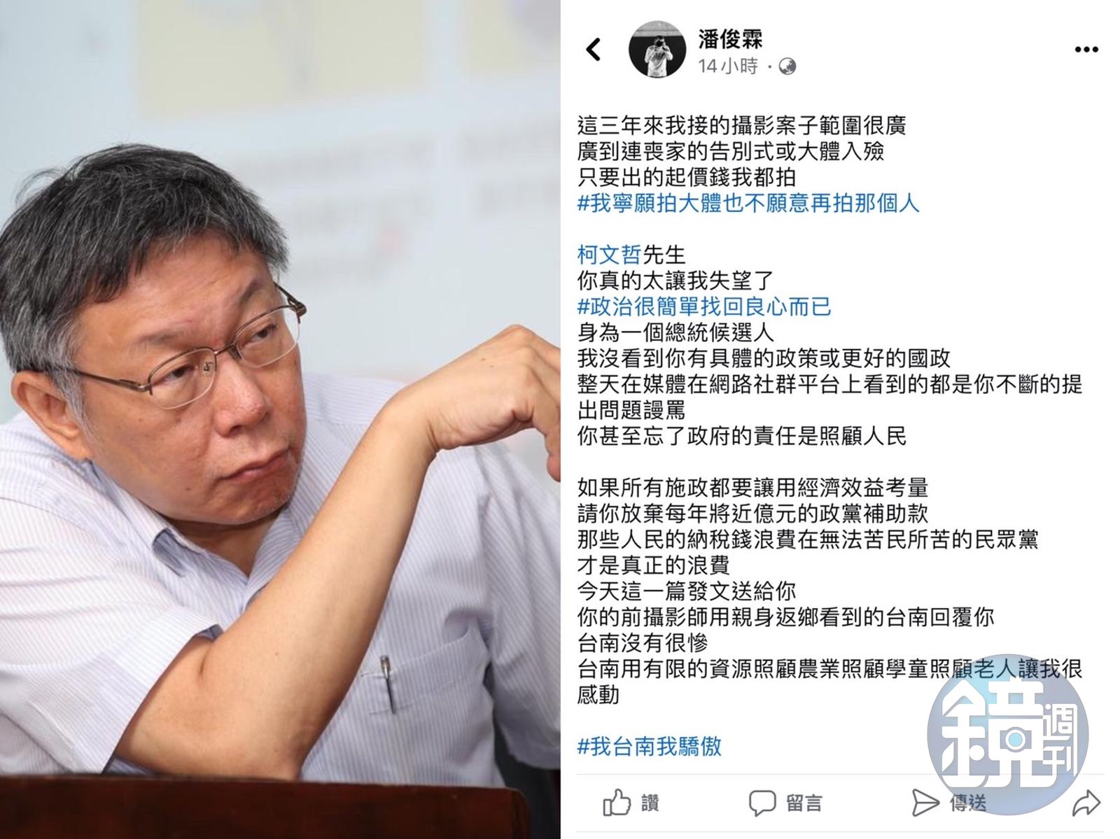 對於柯文哲批評南部的言論,潘俊霖則藉柯語錄「政治很簡單找回良心而已」,並表示「柯文哲先生你真的太讓我失望了」。他指出,柯文哲身為一個總統候選人,卻無提出具體政策,整天在網路社群上謾罵,是「忘了政府的責任是照顧人民」,重批柯「如果所有施政都要讓用經濟效益考量,請你放棄每年將近億元的政黨補助款」,並狠酸他寧可接喪家告別式拍大體入殮,「也不願意再拍那個人」。
