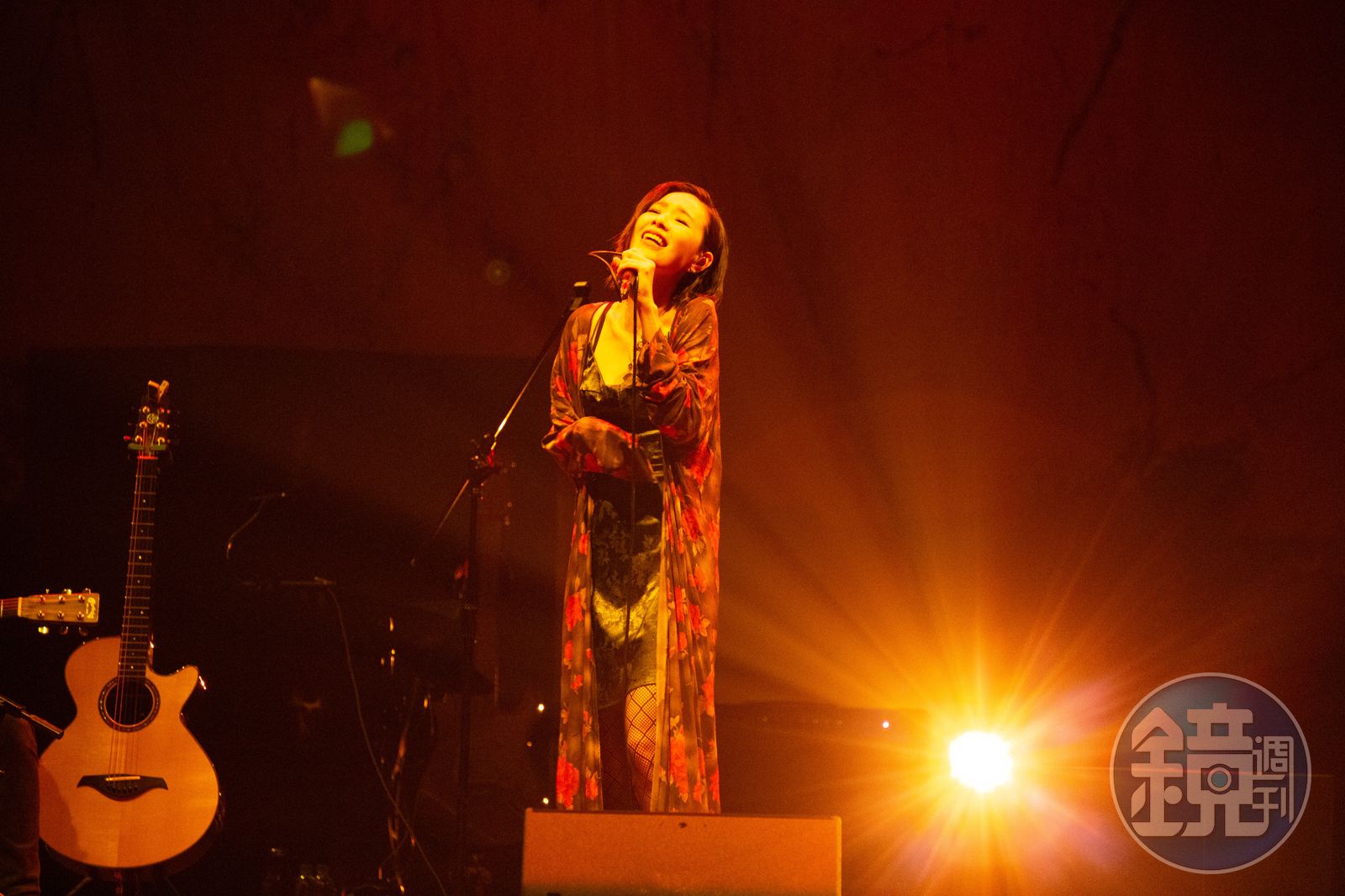 從去年《9522》發行到《潮水箴言》演唱會,幾乎都是黑色造型的安溥,在《時寐》演唱會穿上印有玫瑰圖騰的長罩衫,慵懶的波西米亞龐克風格,內搭孔雀綠短洋裝,絲綢布料上的明暗緹花隱約浮現花朵圖騰,讓她微露美胸與長腿,難得小秀性感,她不忘打趣自嘲:「露腿、露乳、但沒有溝。」