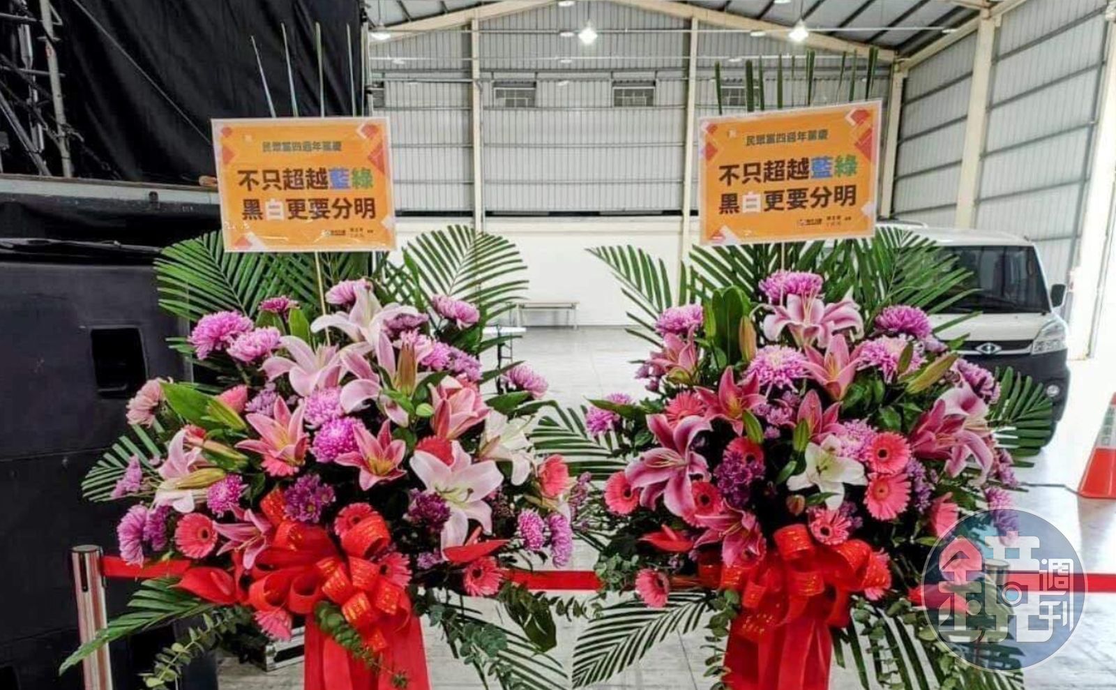 而時代力量黨主席王婉諭的花籃賀卡寫道:「不只超越藍綠,黑白更要分明」。王婉諭上個月在凱道遊行中,直指柯文哲與黑金勢力如鍾東錦、顏清標家族站在一起,稱以白色力量為號召的民眾黨與黑色的距離沒有比藍綠遠到哪裡,嗆柯和牛鬼蛇神站在一起,算什麼第三勢力、算什麼超越藍綠