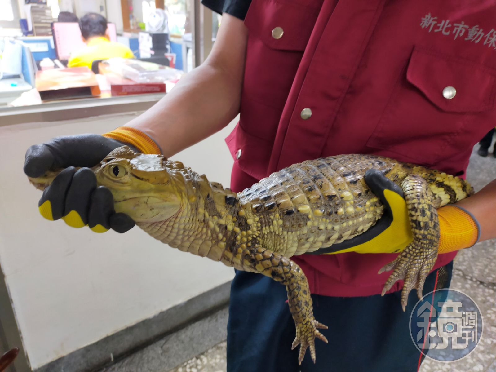 動保處獲報後也立刻派員趕到現場,以套索配合將鱷魚移動至運輸籠內,帶回動保處安置。動保處指出,本次捕獲的鱷魚為眼鏡凱門鱷,身長含尾巴約100公分。眼鏡凱門鱷原產地為中南美洲,體型最大可長至2米,為台灣能合法飼養之鱷魚,但因鱷魚成體體型巨大,所需之飼養空間也須隨之調整,建議民眾於飼養動物前務必考量自身所能提供的環境和飼養能力,以保障動物福祉。