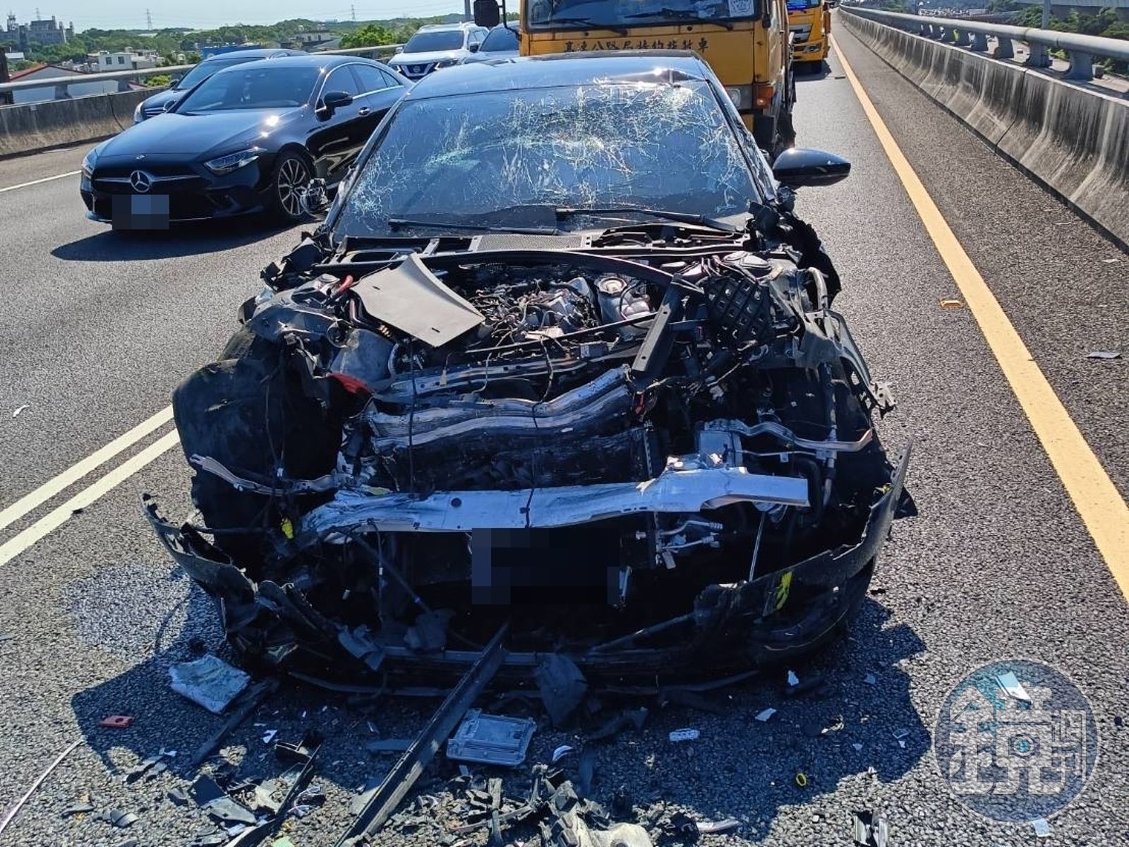 警方表示,高公局委外施工廠商的緩撞車,今午在國道1號五楊高架北向41.7公里林口路段內側高乘載車道,協助前方移動性清掃作業工程後方警戒,但一名許姓男子(48歲)駕駛黑色轎車,疑似因未注意車前狀況,未減速撞上緩撞車肇事,所幸緩撞設施減緩撞擊力道,許男幸運僅有些微不適,無需送醫,但轎車車頭幾乎全毀。