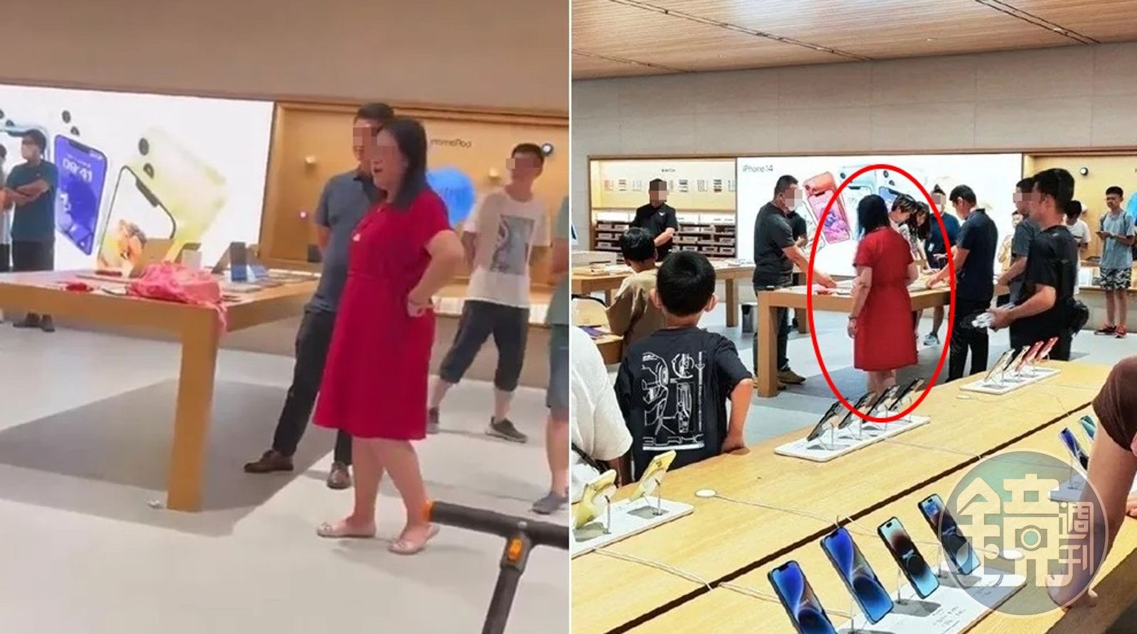 北京一名大媽闖進蘋果專賣店砸毀產品,並痛罵使用iPhone的人都是漢奸。(翻攝自微博)發布時間:2023.08.11 11:13 臺北時間