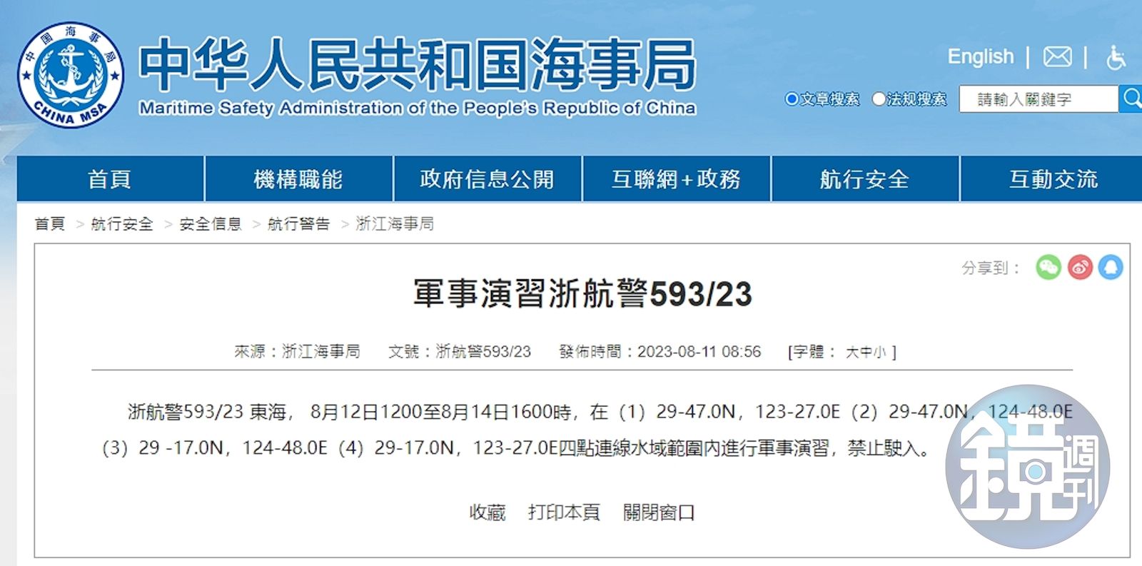 中國海事局預告明起在東海進行軍事演習。(翻攝自中國海事局)發布時間:2023.08.11 16:18 臺北時間