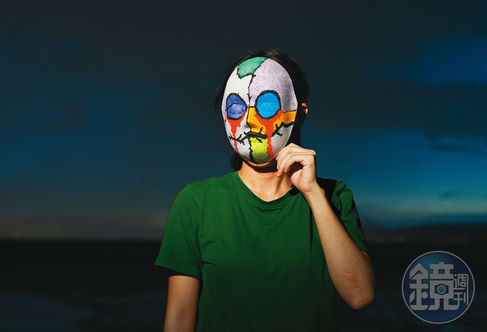 至於小云,由於她希望不露面受訪,二訪時,我們請她繪製一張代表自己的面具進行拍攝。她細心均勻塗畫白色面具,隨著面具漸漸完成,我們不再有一搭沒一搭地說話,僅剩蠟筆刮出規律沙沙沙的聲音。「是不是有點Creepy(詭異)?」她拿著成品,上頭的黑色粗線條將臉分割成數塊,眼睛是飽和的藍色,流出血紅色的眼淚,原本應該是嘴巴的部位,是條蜿蜒的荊棘,「我想的就是,沒有嘴巴,只有一條裂開這樣。」她有些虛弱地說:「畫畫應該有釋放一些東西出來,滿強大的,我也有嚇到了,可以這樣表達感受。」